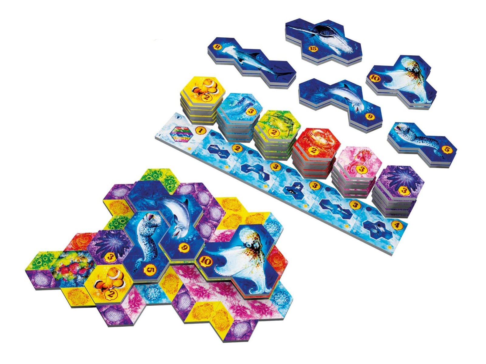 - Обеспечить биоразнообразие – после размещения маленьких животных вы можете привлечь большое морское животное. Для этого разместите его жетон поверх нескольких маленьких животных, соблюдая ключевое правило: все накрытые маленькие животные должны быть разными видами. Большое животное должно полностью покрывать выбранных маленьких обитателей.