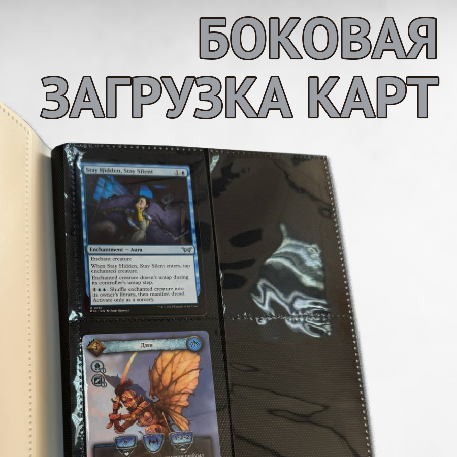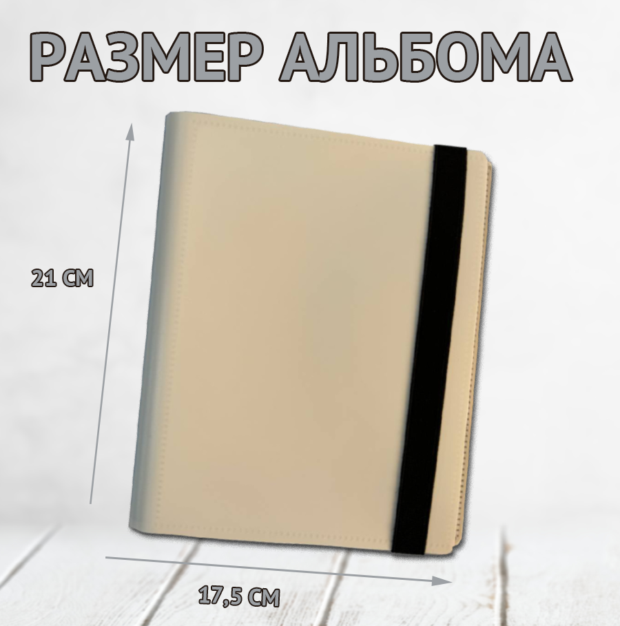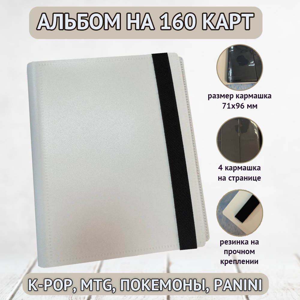 Альбом вмещает 160+ карт, позволяет хранить более одной карты в ячейке и идеально подойдет для карт размерами до 69х94 мм.
