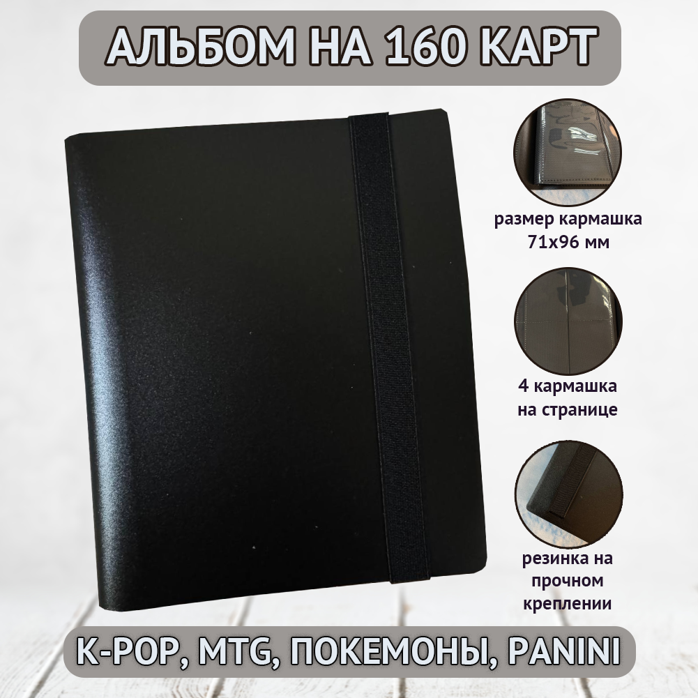 Альбом вмещает 160+ карты, позволяет хранить более одной карты в ячейке и идеально подойдет для карт размерами до 69х94 мм.
