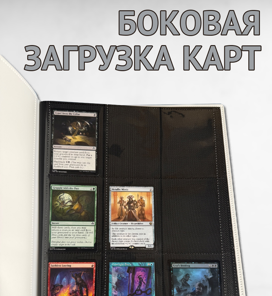 Альбом вмещает 360+ карты, позволяет хранить более одной карты в ячейке и идеально подойдет для карт размерами до 69х94 мм.