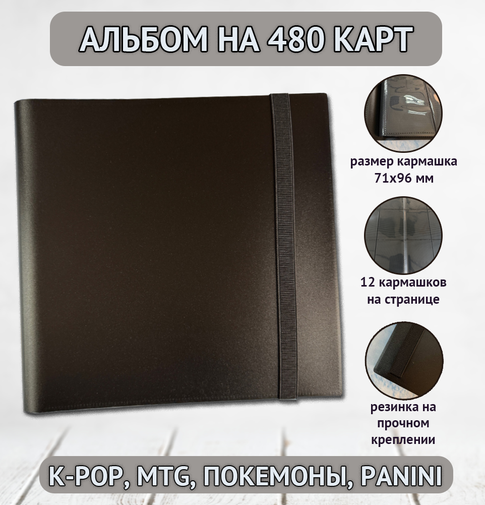 Альбом вмещает 480+ карт, позволяет хранить более одной карты в ячейке и идеально подойдет для карт размерами до 69х94 мм.