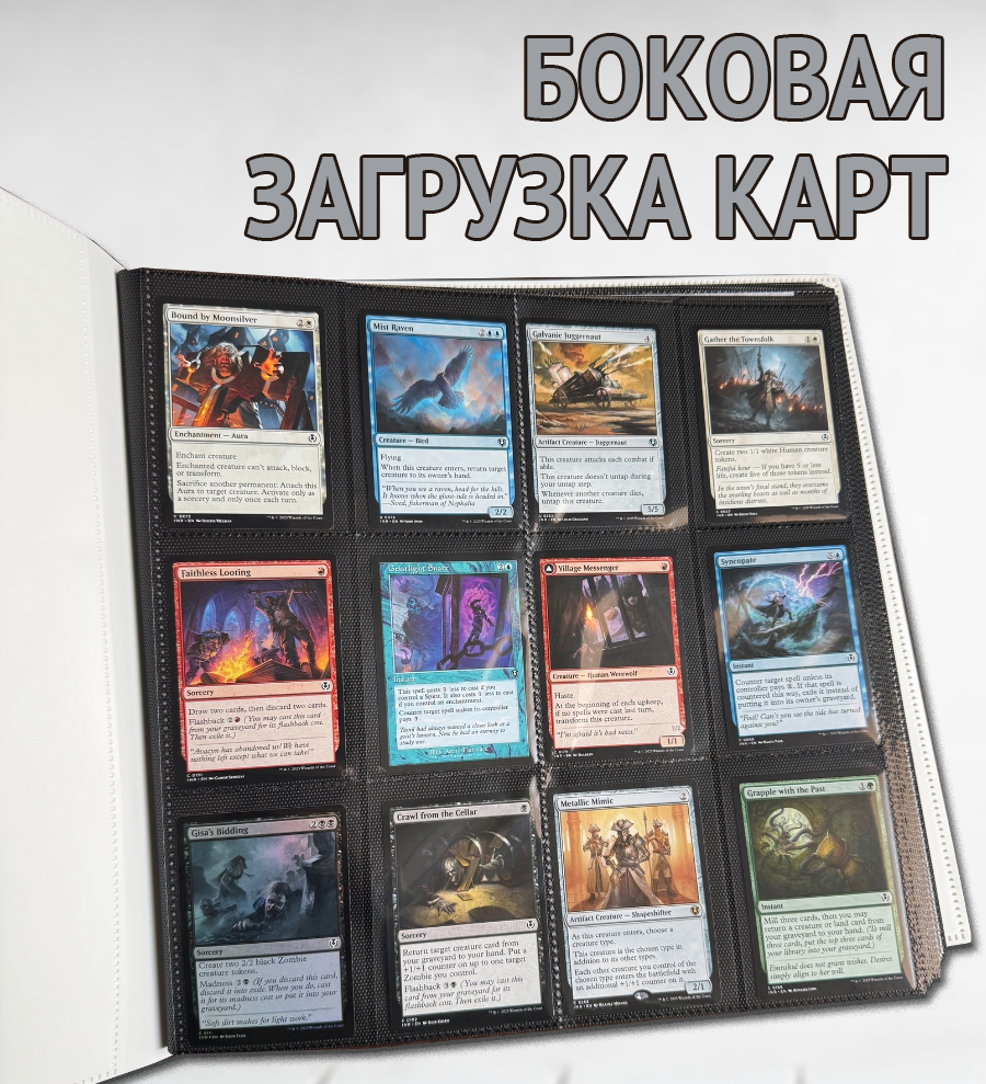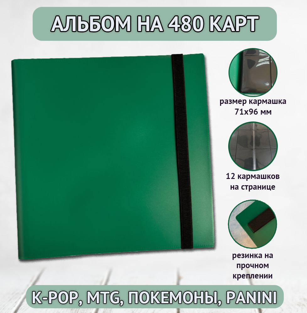 Альбом вмещает 480+ карт, позволяет хранить более одной карты в ячейке и идеально подойдет для карт размерами до 69х94 мм.