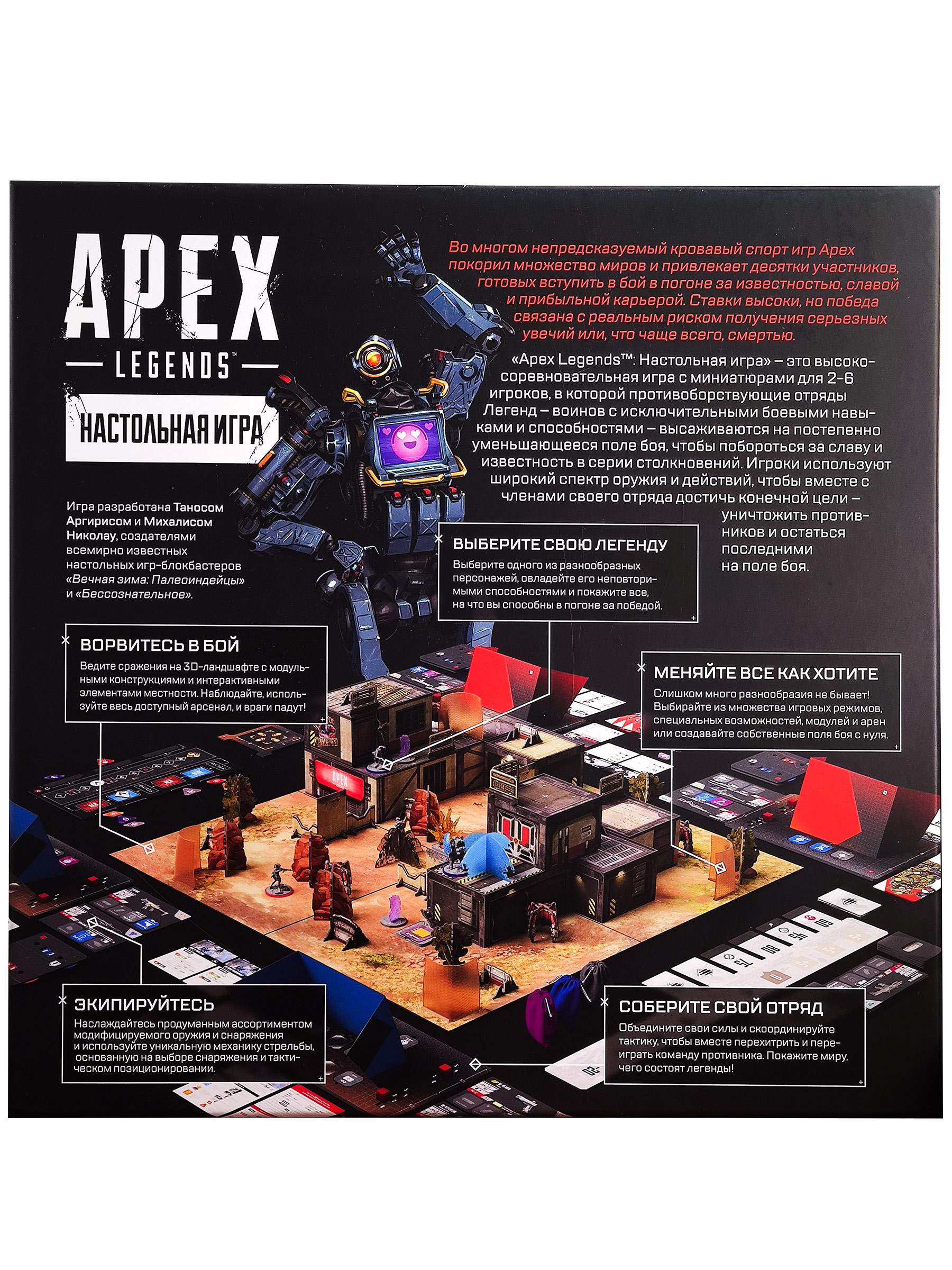 «Apex Legends: Настольная игра» — это высокосоревновательная игра с миниатюрами для 2–6 игроков, в которой противоборствующие отряды Легенд высаживаются на постепенно уменьшающееся поле боя, чтобы побороться за славу и известность в серии столкновений. Игроки используют широкий спектр оружия и действий, чтобы вместе с членами своего отряда достичь конечной цели — уничтожить противников и остаться последними на поле боя.