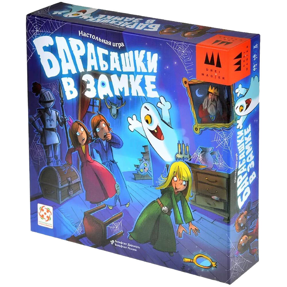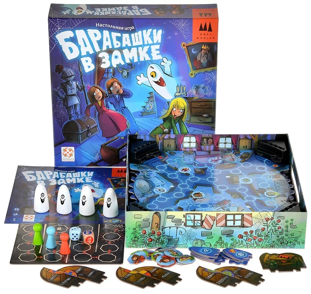 "Барабашки в замке" – это захватывающая кооперативная игра, где вам предстоит помочь трём чародеям выбраться из заколдованного замка, полного коварных призраков. Каждый маг должен выполнить пять заданий, собирая жетоны с волшебными предметами, и успеть покинуть замок до того, как все ворота захлопнутся. Уникальная механика игры включает в себя передвижение юных искателей приключений, вращение колеса призраков и случайные события, которые могут как помочь, так и усложнить вашу задачу. Яркое игровое поле, детализированные фигурки и атмосферные иллюстрации погружают в мир таинственного приключения. А если стандартный режим покажется вам слишком простым, к вашим услугам экспертная сложность с четвёрт барабашкой!