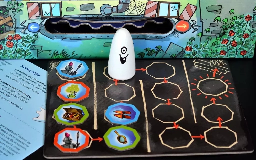 В свой ход бросайте два кубика: голубой определяет, на сколько клеток можно передвинуть мага, а кубик призраков заставляет колесо вращаться, перемещая духов по замку. Осторожно планируйте маршруты – маги не могут проходить сквозь призраков, а случайное столкновение грозит закрытием ворот! Выполняйте задания, открывая новые жетоны, и помогайте друг другу, ведь победа зависит от слаженных действий всей команды. Будьте готовы к неожиданностям: карточки призраков могут как спасти ваших героев, так и ускорить их пленение.