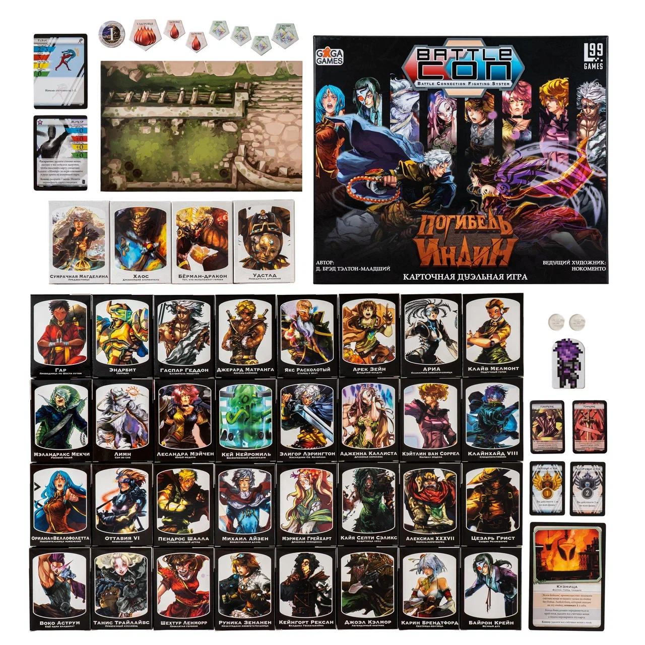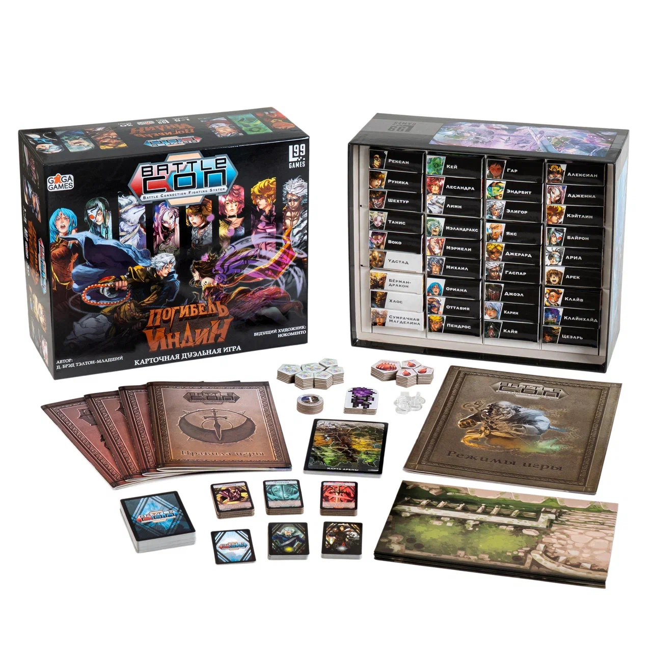 Погибель Индин — самая большая коробка и квинтэссенция всей серии! Здесь есть игровые режимы на любой вкус: дуэльный 1 vs 1, асимметричные 1 vs 2, 1 vs 3 и даже эпический босс-файт 1 vs 4. А также командный режим 2 vs 2, соло и кооперативное сюжетное приключение. Идеальный набор, чтобы с головой нырнуть во вселенную BattleCON. А, объединив его с Испытаниями и Странниками Индин, вы получите ультимативный файтинг с 52 героями и неиссякаемой реиграбельностью.