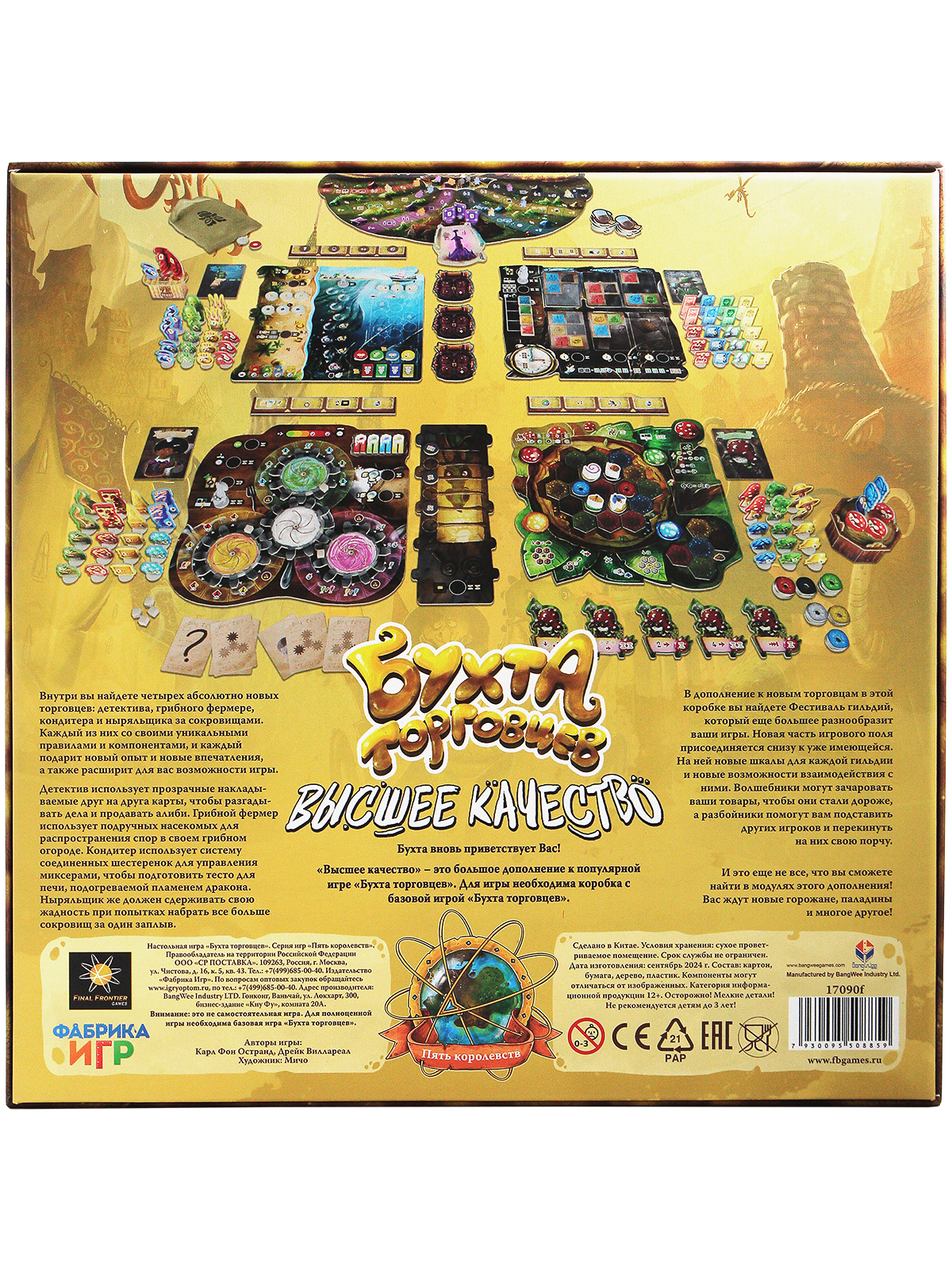 Внутри вы найдете четырех абсолютно новых торговцев: детектива, грибного фермера, кондитера и ныряльщика за сокровищами. Каждый из них со своими уникальными правилами и компонентами, и каждый подарит новый опыт и новые впечатления, а также расширит для вас возможности игры. Детектив использует прозрачные накладываемые друг на друга карты, чтобы разгадывать дела и продавать алиби. Грибной фермер использует подручных насекомых для распространения спор в своем грибном огороде. Кондитер использует систему соединенных шестеренок для управления миксерами, чтобы подготовить тесто для печи, подогреваемой пламенем дракона. Ныряльщик же должен сдерживать свою жадность при попытках набрать все больше сокровищ за один заплыв.