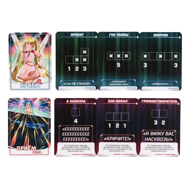 А это ещё что за оглушающие звуки? Встречайте, громкоголосый айдол под псевдонимом Шумная! Она устроит настоящее шоу и заставит соперников бояться каждого звука. Цифры на её картах приёмов — это точное количество пуль, которое должно быть в соответствующих столбцах. Разыгрывая приём, убирайте любые пули из указанного столбца на своём планшете. Шумной всё равно, что играет, главное — музыку погромче, а пуль побольше. Поэтому вам часто придётся копить их, чтобы разыграть карту. С риском для жизни, конечно.