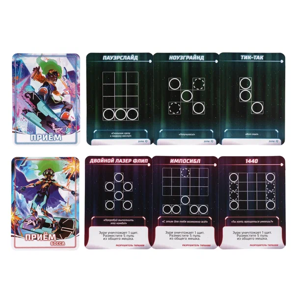 Зури Касанго — дерзкий уличный художник, профессиональный ховербордист и по совместительству уничтожитель зла. Она обожает побеждать и прокручивать улётные комбо. Её уникальная способность тем сильнее, чем больше приёмов вы используете за раунд. Разыгрывая карту приёма, сразу берите следующую из колоды. Если не повезло с картами, вы можете взять новые приёмы. Да и сбрасывать карты вам только на руку, ведь в конце раунда стремительная Зури убирает пули со своего планшета перестрелки именно благодаря картам в сбросе! Кто же сможет за ней угнаться?