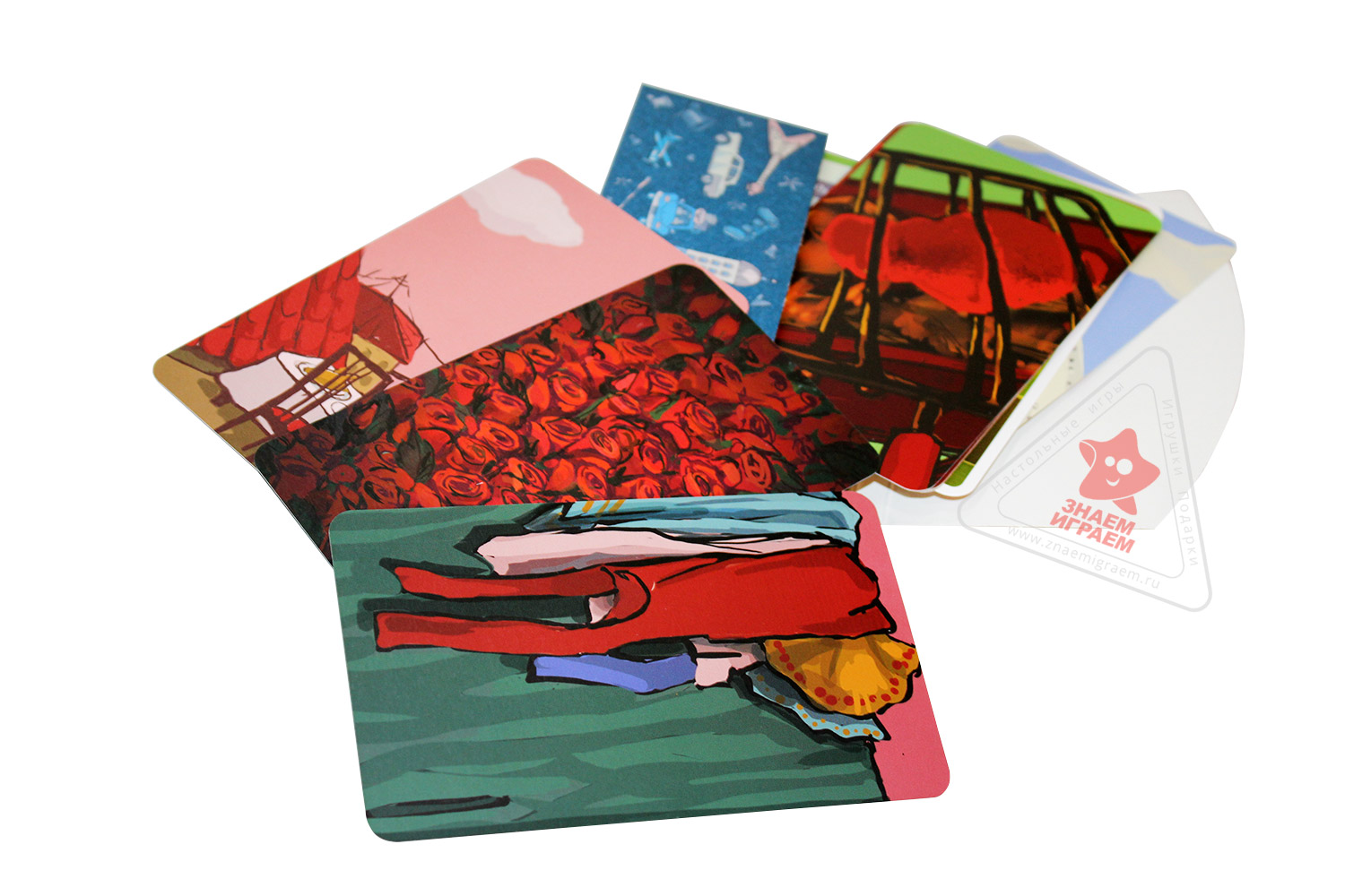 - 15 карт для него и 15 карт для неё с заданиями. Размер карты 145 миллиметров на 91 миллиметр, то есть это нечто среднее между большими картами и открытками. Каждая карта красочно проиллюстрирована в неоимпрессионистском стиле;