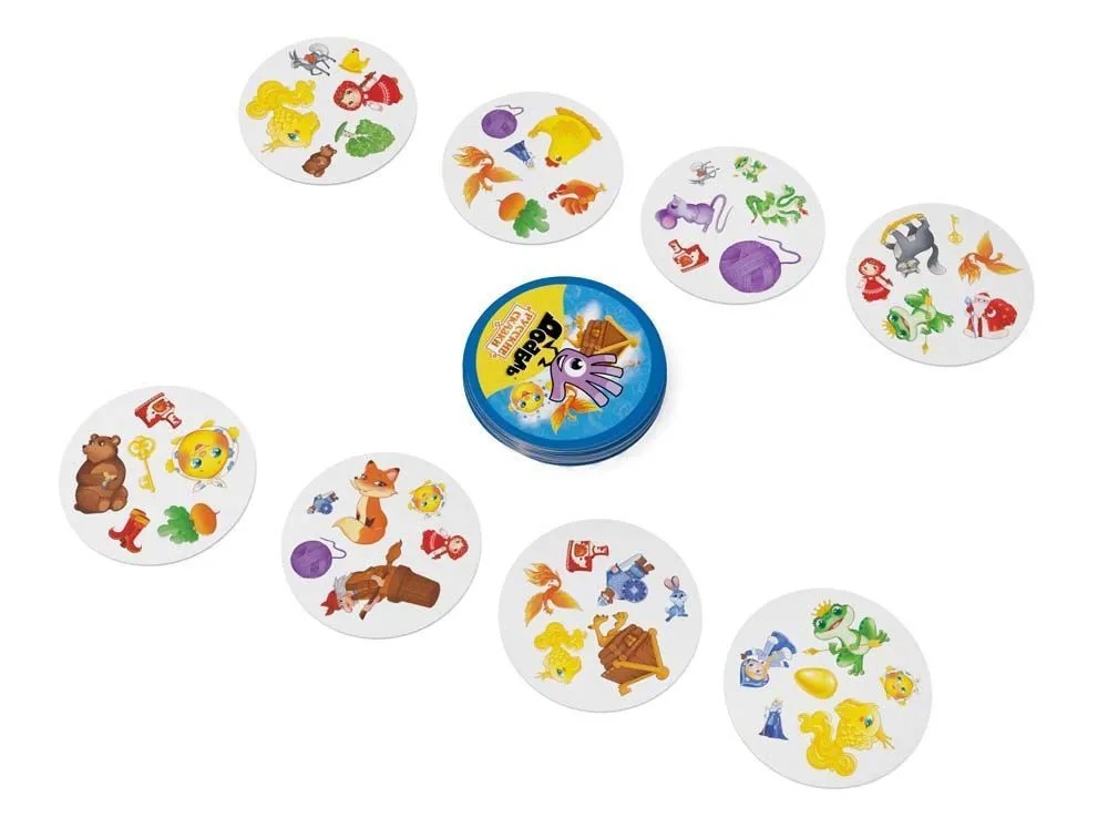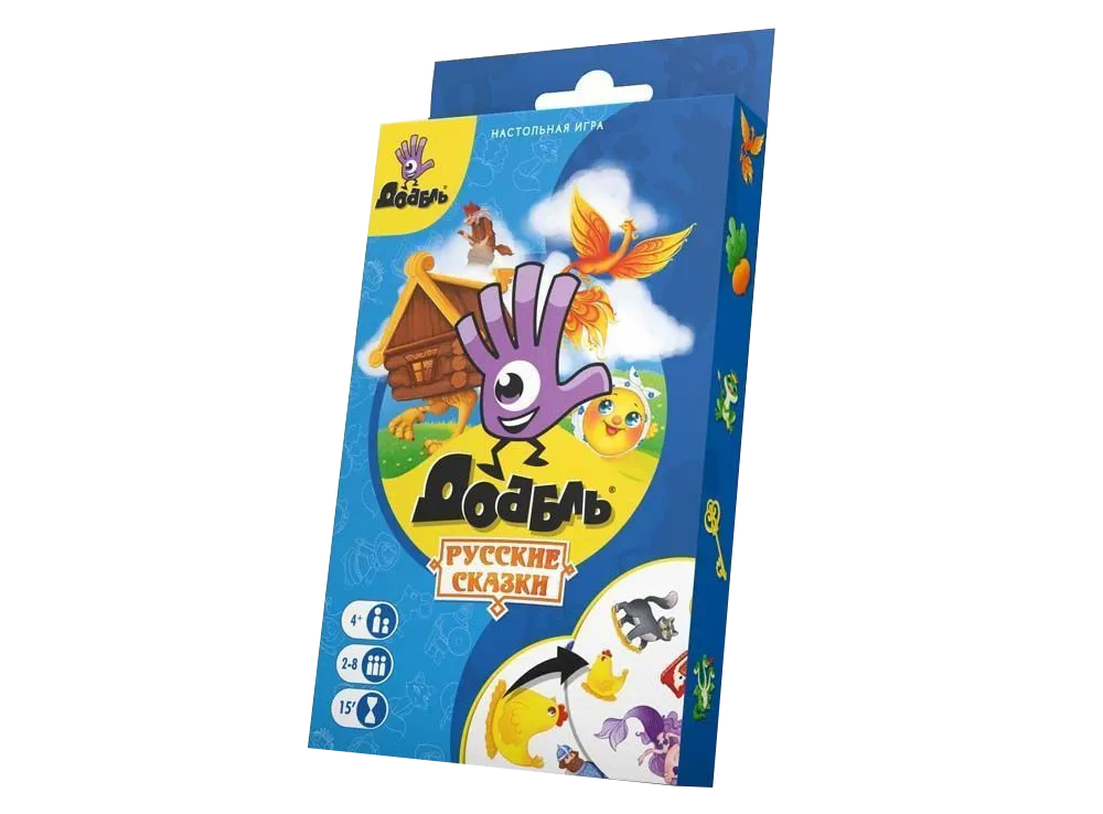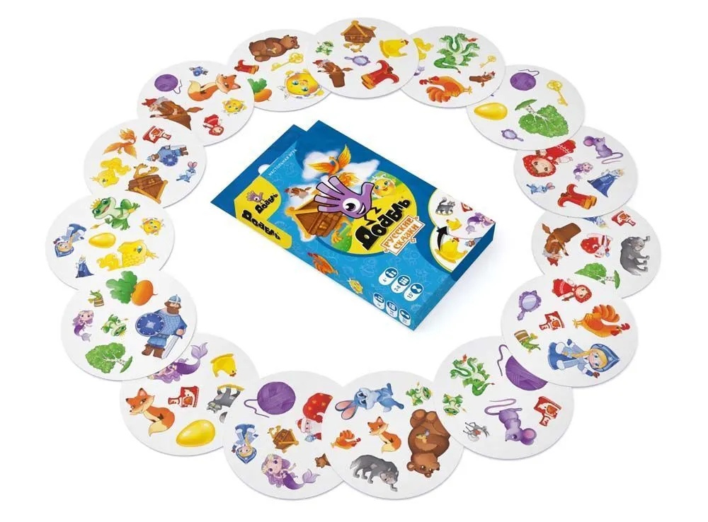 "Доббль. Русские сказки" - быстрая весёлая игра, развивающая зрительное восприятие, внимательность и реакцию. Это специальная версия мирового хита "Доббль" для малышей с любимыми героями из русских сказок.