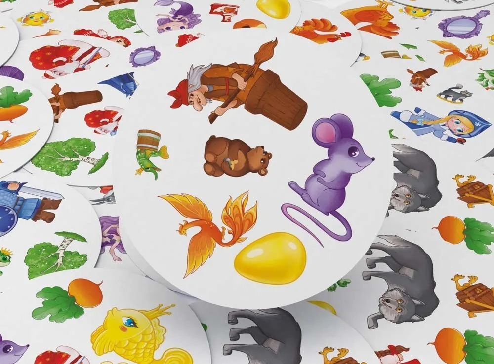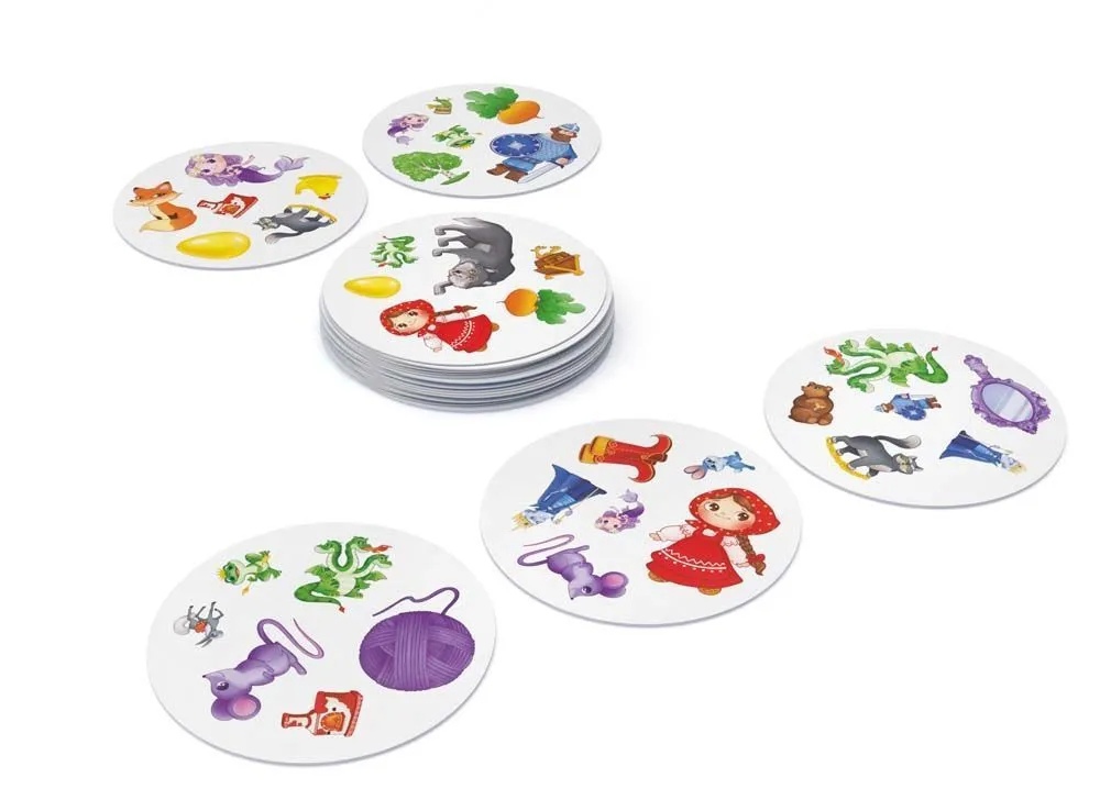 В небольшой картонной коробочке вы найдёте 30 круглых карточек, на которых изображены персонажи из любимых сказок. Тут можно встретить и Деда мороза со Снегурочкой, и серого волка с зайкой, и Змея Горыныча с Богатырём! На каждой карте нанесён уникальный рисунок, но на любых двух картах вы всегда сможете найти одно единственное совпадение. Оно есть всегда! И если с первого раза вы его не заметили, просто рассмотрите и сравните две карточки более внимательно.