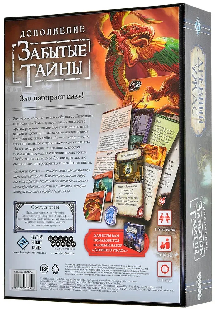 Древние выходят в открытое наступление, и только бесстрашные сыщики могут остановить надвигающееся зло. Путешествуйте по городам, закрывайте порталы, сражайте жутких тварей из других тёмных миров. "Забытые Тайны" – это дополнение для известной игры "Древний Ужас", которое не оставит равнодушным ни одного любителя произведений Лавкрафта. В забытых преданиях скрывается последняя надежда на спасение человечества. Но успеют ли сыщики раскрыть давно забытые тайны?..