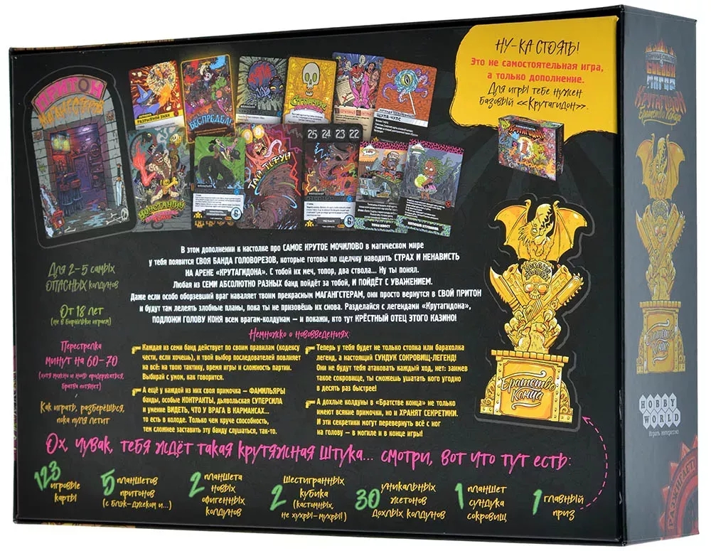 Перед вами полностью самостоятельная игра, которую не получится соединить с какой-либо предыдущей частью, да это и не потребуется, ведь в пылу Крутагедона некогда будет вспоминать о чём-то другом! Разве что планшеты колдунов можно использовать в другой игре. Итак, что же ждёт игроков в этой большой коробке: