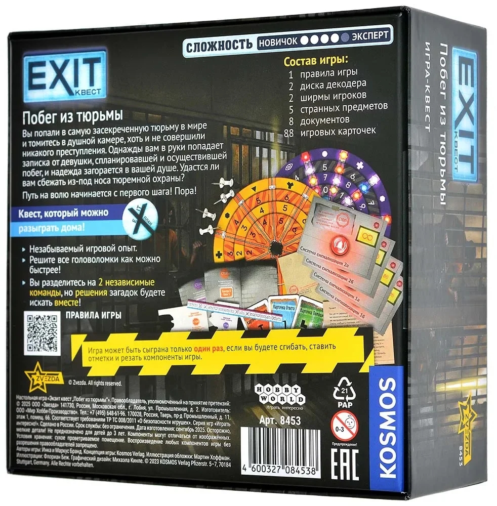 Игры серии EXIT напоминают популярные квесты в реальном времени: вы оказываетесь в центре любопытной истории и решаете различные головоломки, чтобы выбраться из трудной ситуации. Выпуск "Побег из тюрьмы" подойдёт уверенным игрокам, готовым к нетривиальным вызовам. Здесь вы разделитесь на две независимые команды, но, как и прежде, сможете искать решения загадок вместе. Будьте внимательны, обращайте взор на детали и не бойтесь экспериментировать с компонентами: сгибайте, режьте и раскрашивайте детали игры, чтобы как можно скорее найти выход!