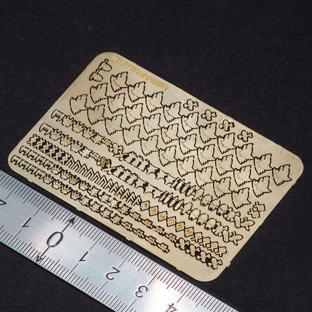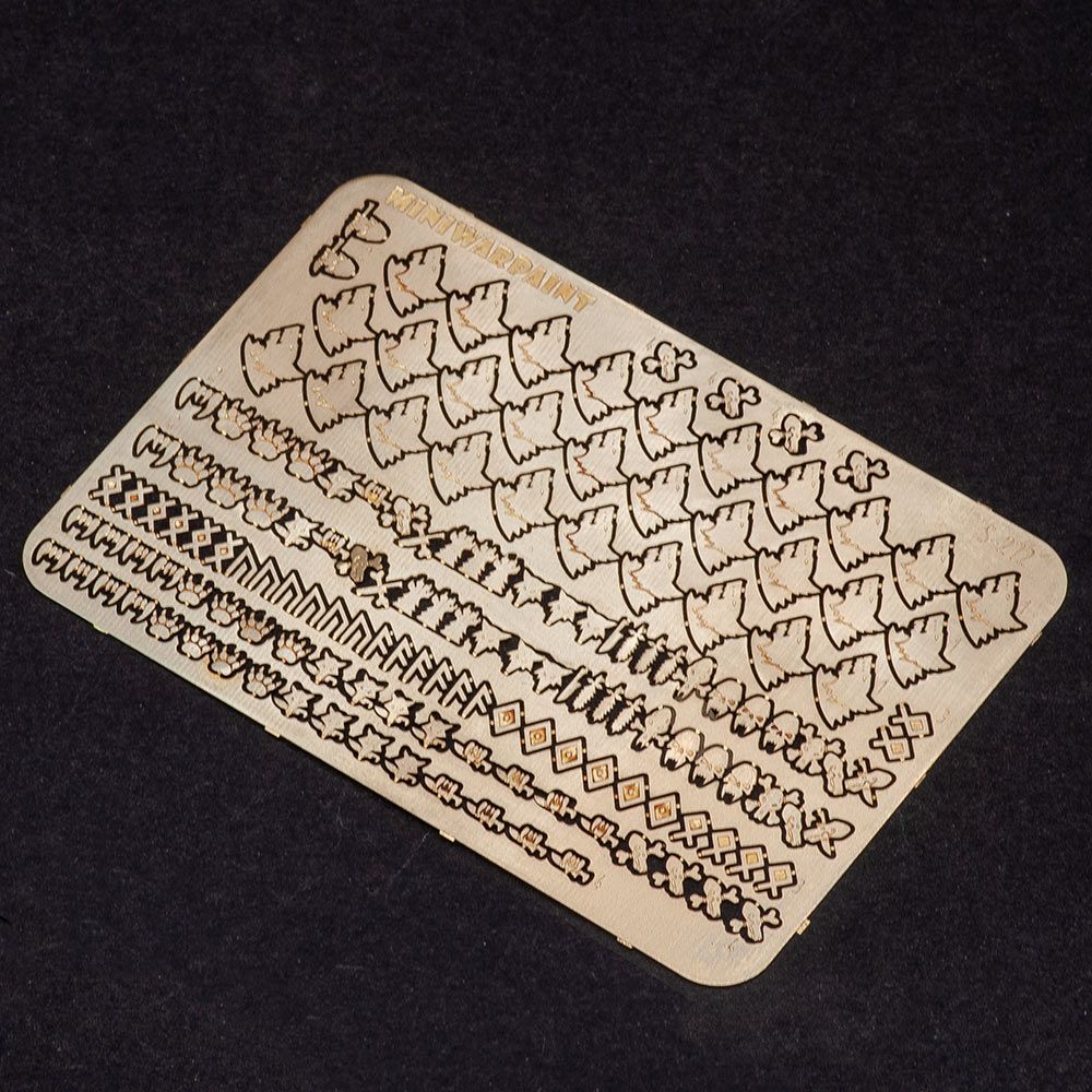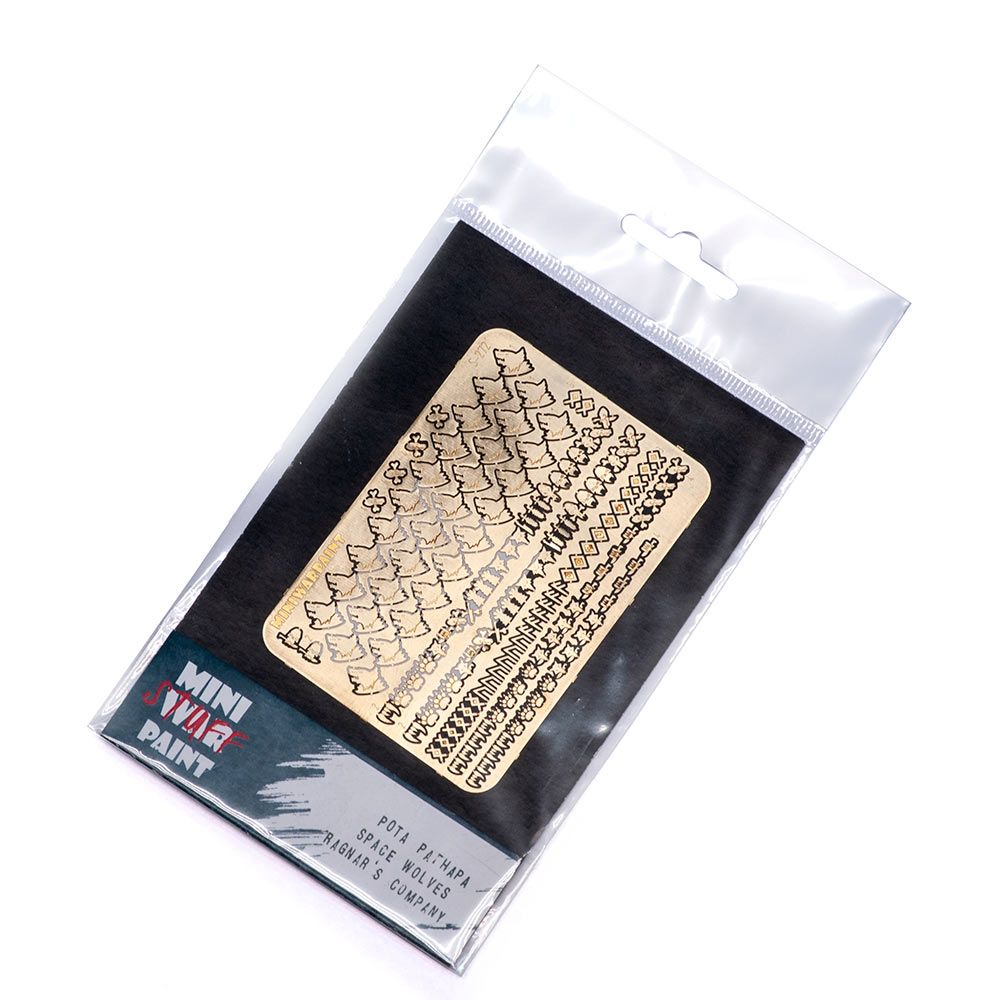 Набор фототравленых латунных дополнений для миниатюр. Набор содержит символы спейсмаринов из вселенной Warhammer40000, ордена Space Wolves, Черногривых, роты Рагнара, располагаемые на левых наплечниках, а так же символы отделений и героев, располагаемые на правых наплечниках и наколенниках.