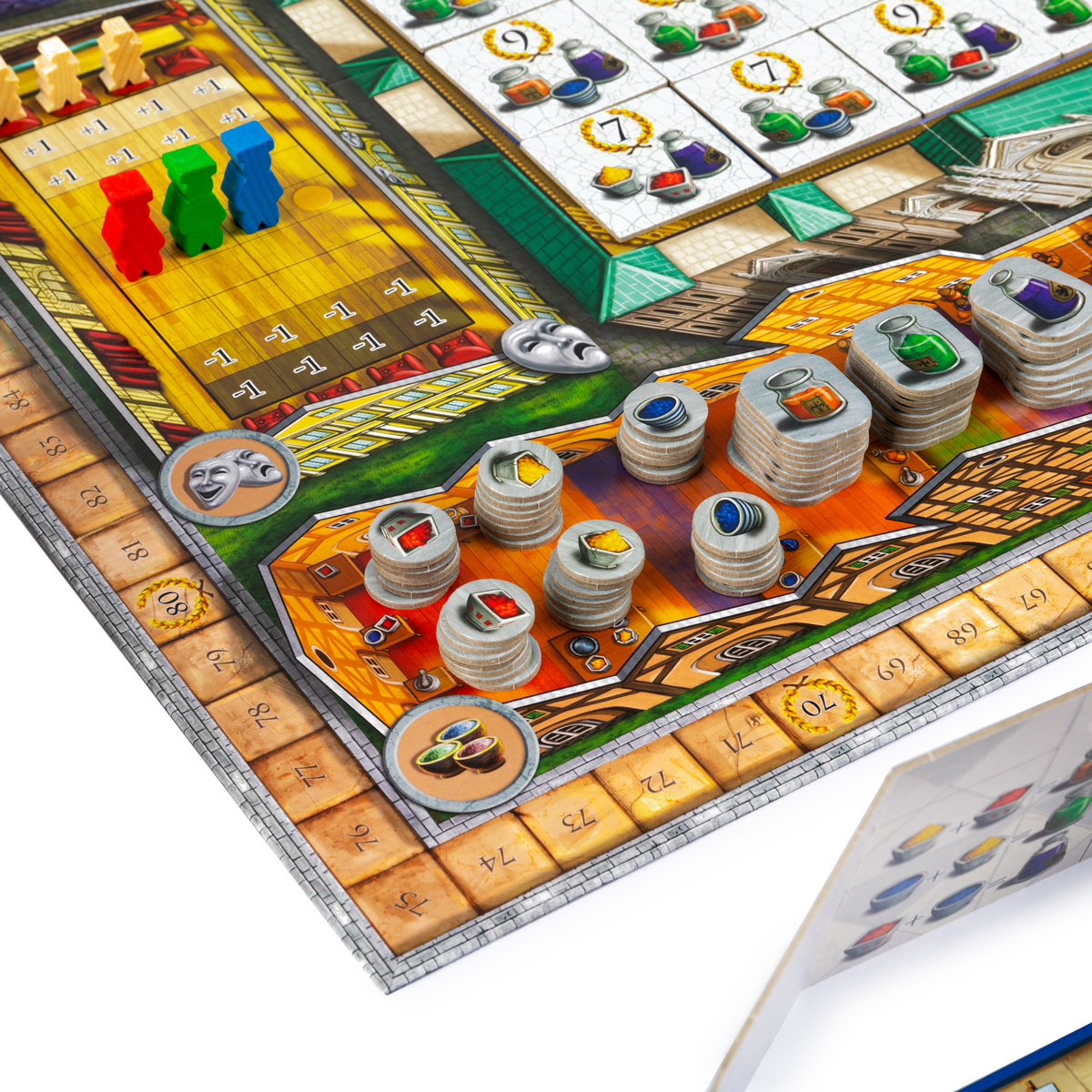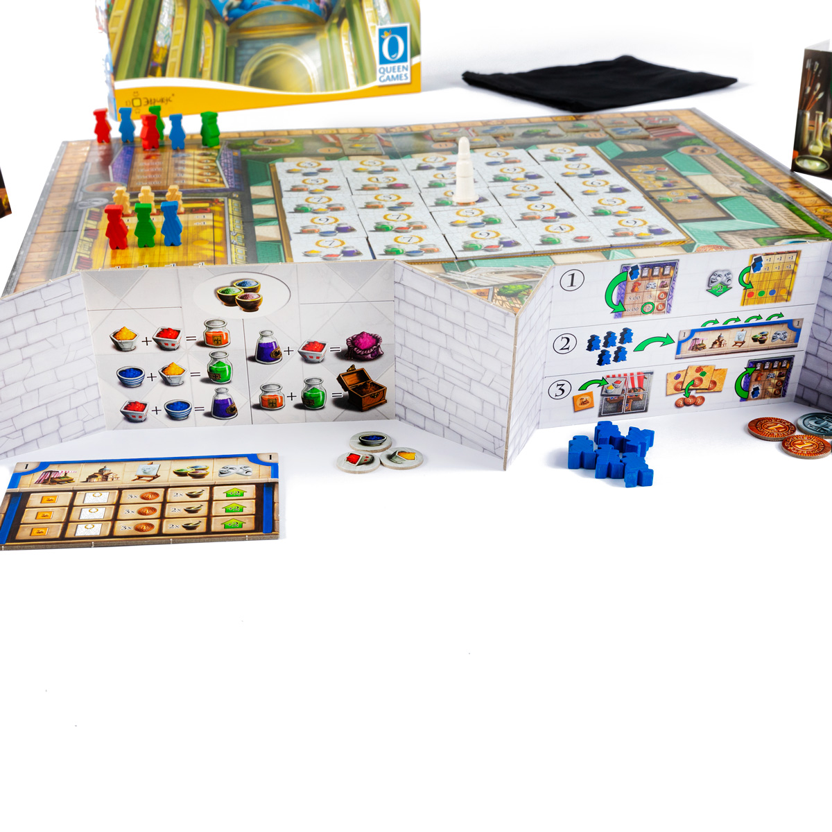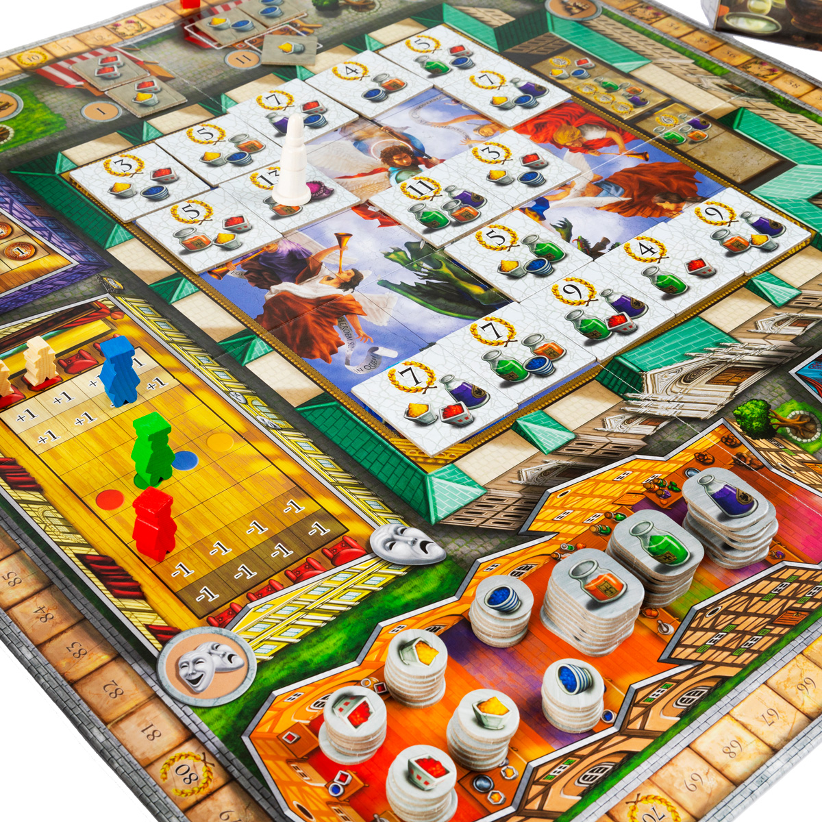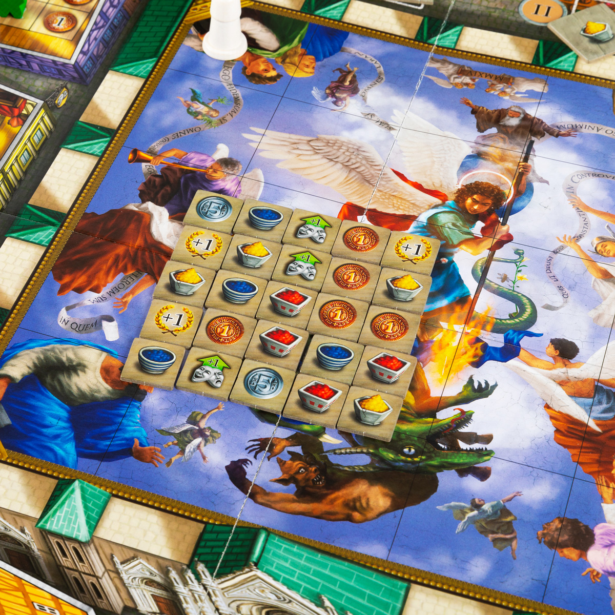 - Собор: Восстановить фрагмент фрески (сбросить нужные краски, получить очки и переместить епископа) или реставрировать алтарь (получить очки за набор цветов).