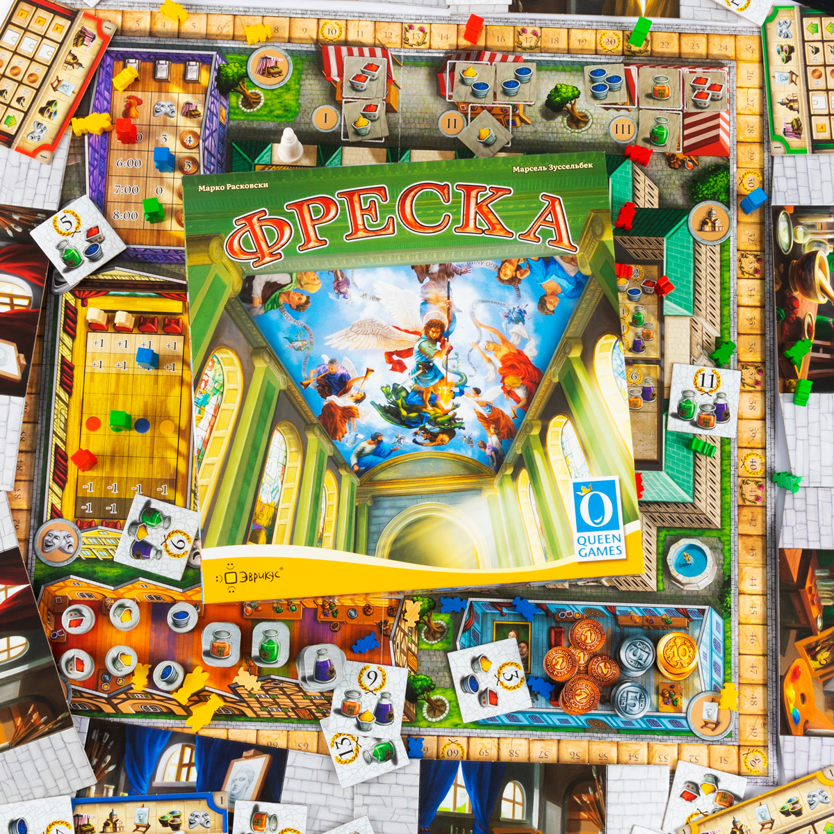 «Фреска» — это уже ставшая классикой и зарекомендовавшая себя в настольном мире игра, основной механикой которой является планирование действий. Именно от вашего выбора зависит, сколько и каких действий вы сможете выполнить в течение раунда. Ваша цель - получить как можно больше победных очков, чтоб победить. Вы будете получать победные очки за отреставрированные фрагменты фрески, за работы по реставрации алтаря, а также за благосклонность Епископа, который и является вашим заказчиком.