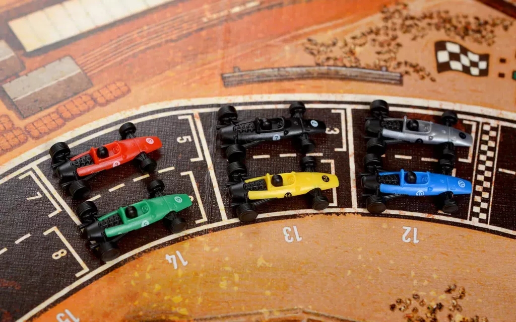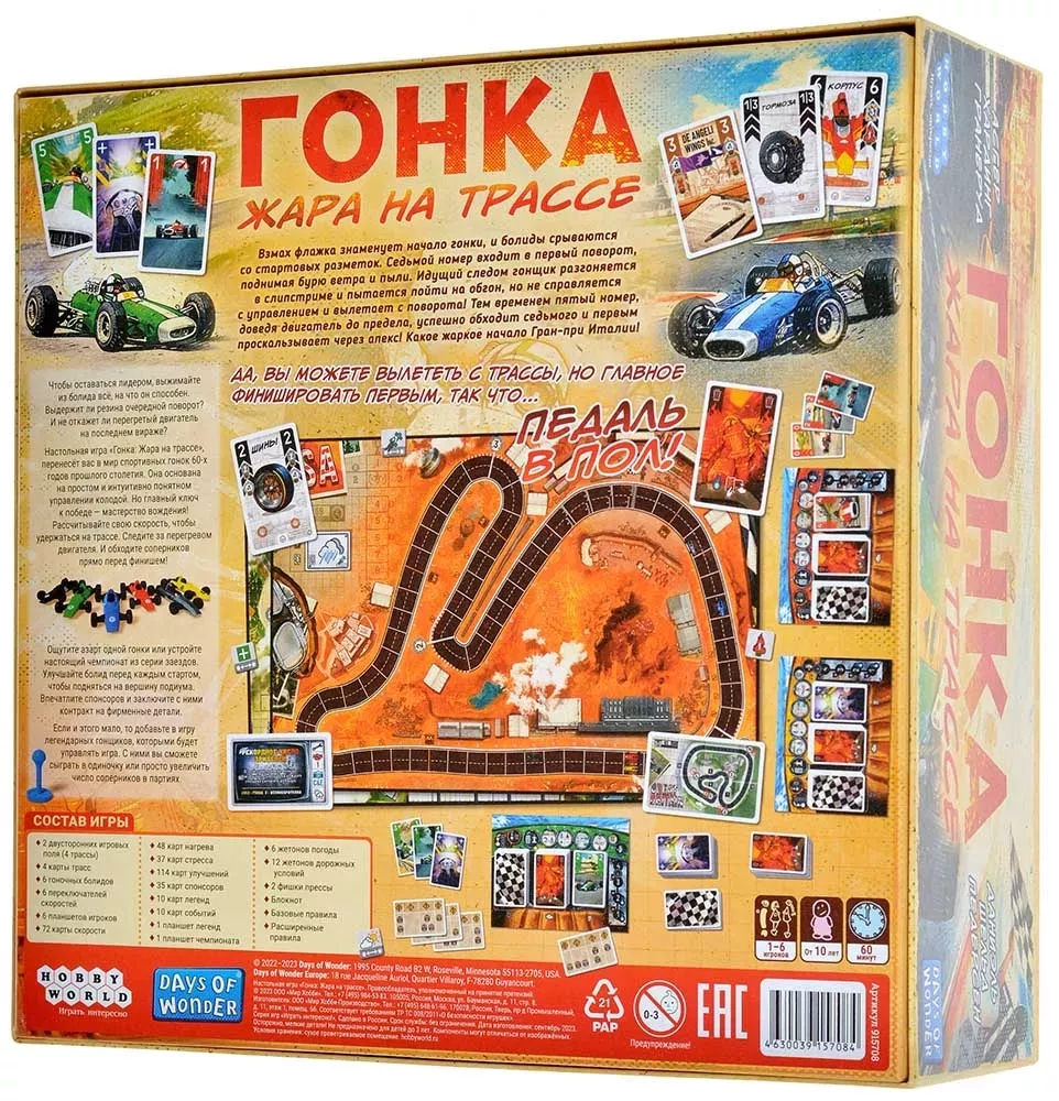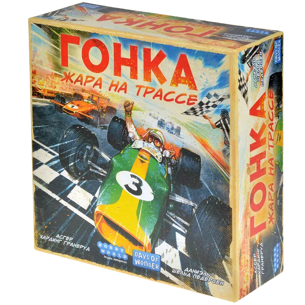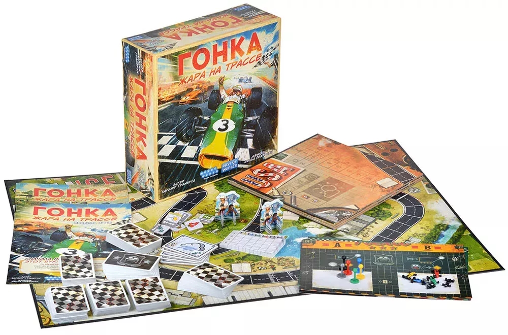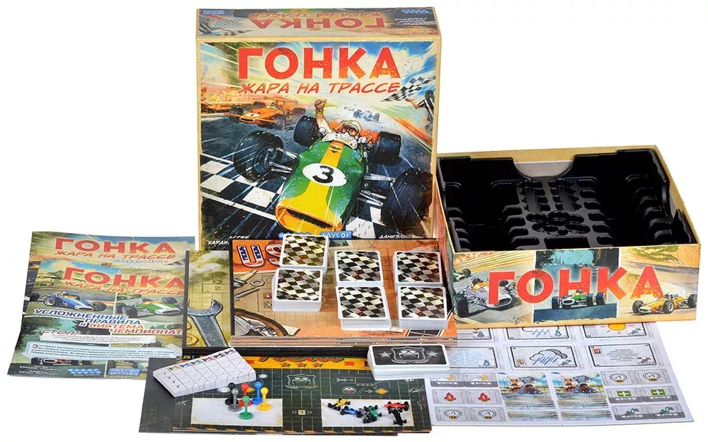 В настольной игре "Гонка: Жара на трассе" вас ждёт скорость, скорость и ещё раз скорость! Перенеситесь в мир автоспорта 60-х годов, сядьте за руль собственного болида и станьте героем всех гоночных треков! Но помните, что "газ в пол" – не единственная стратегия, которой нужно придерживаться: хватит ли резины на ещё один занос? Не накроется ли перегретый двигатель в самый неподходящий момент? Да и хватит ли вам квалификации?