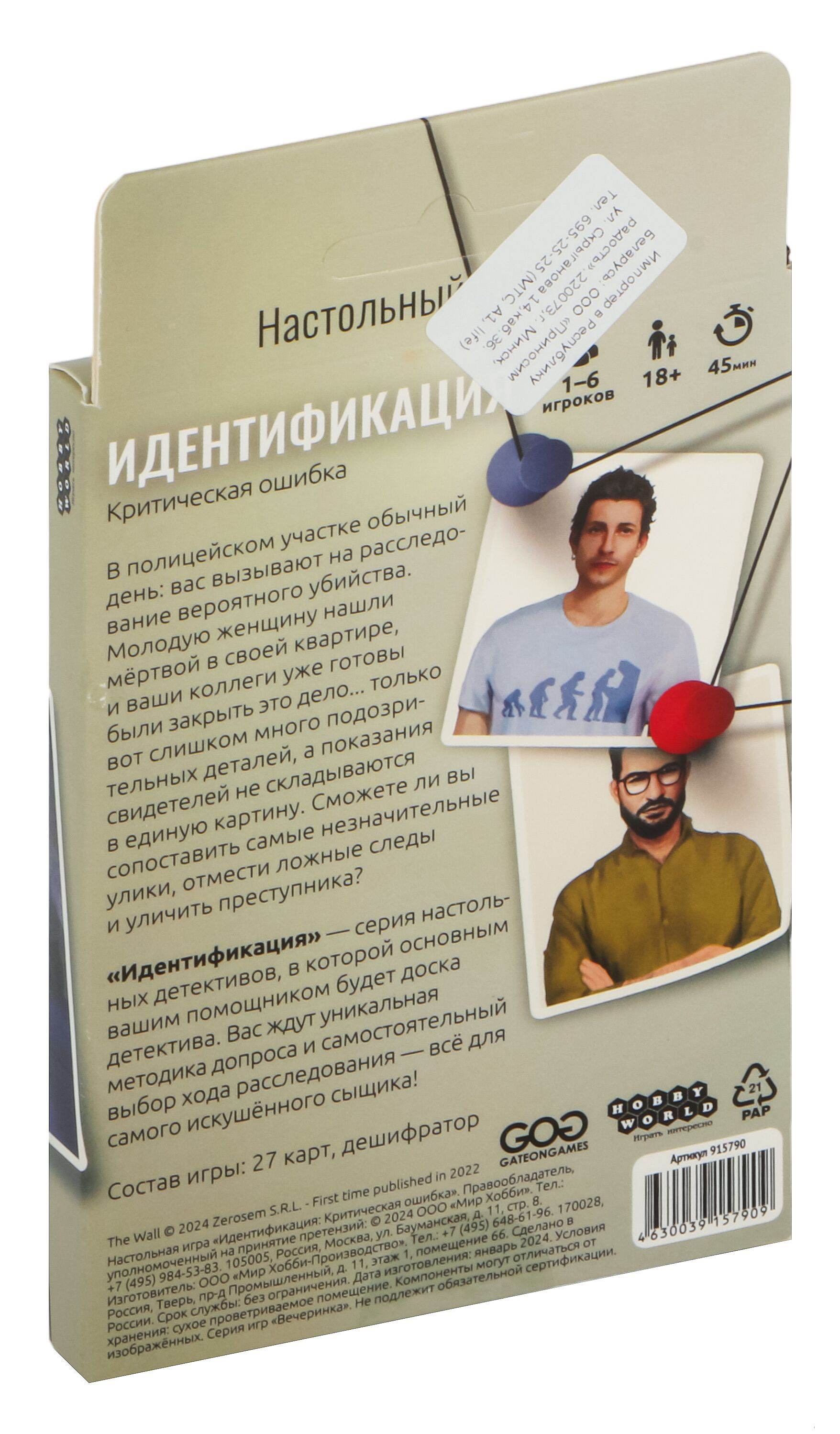 Серия настольных детективных игр "Идентификация" предлагает вам стать настоящим детективом. Вам предстоит провести допросы, разобраться с показаниями свидетелей и досконально исследовать каждую малейшую улику. Ваш незаменимый помощник – детективная доска, которая поможет собрать все фрагменты в единое целое и раскрыть истину об убийстве.