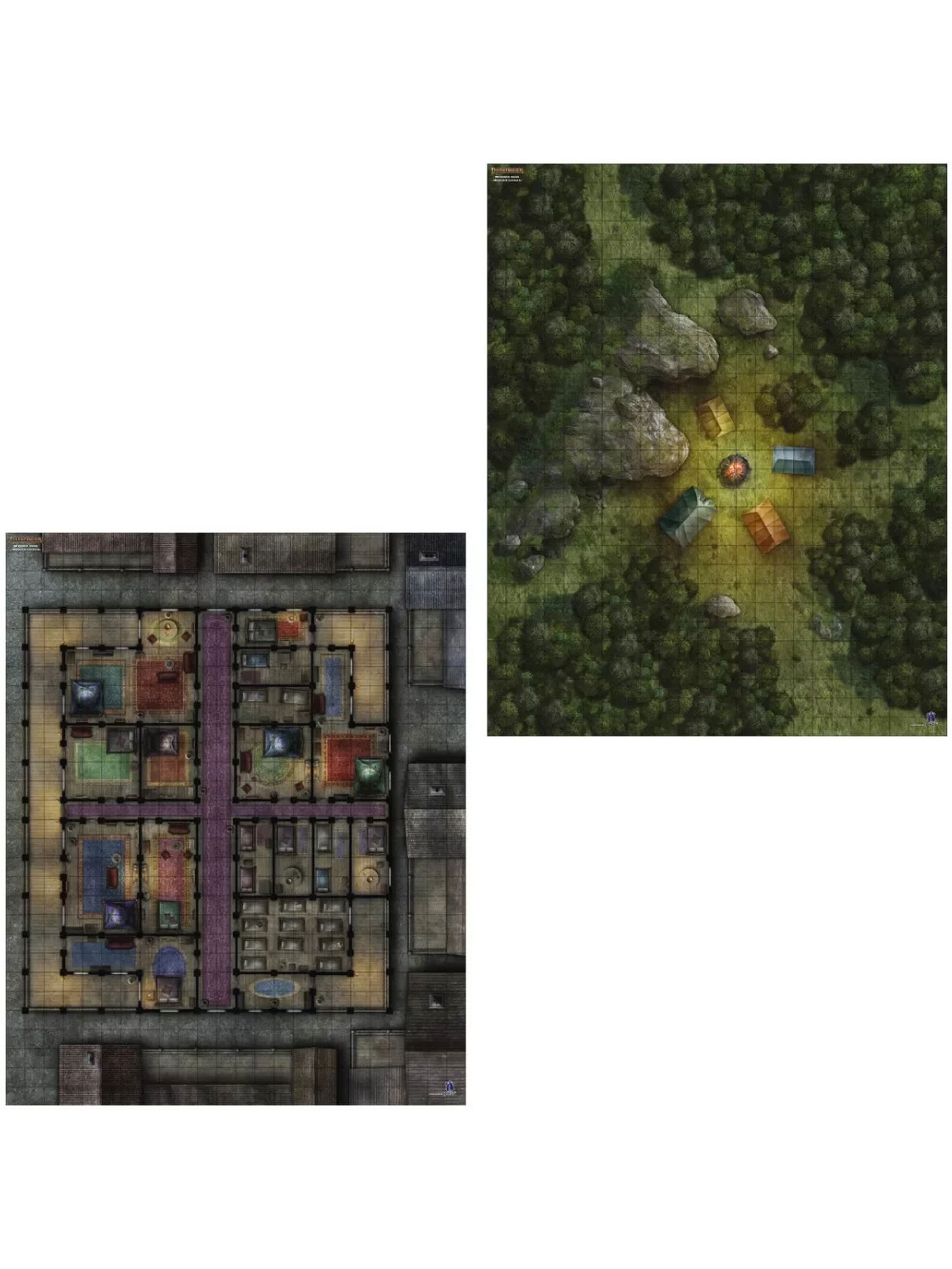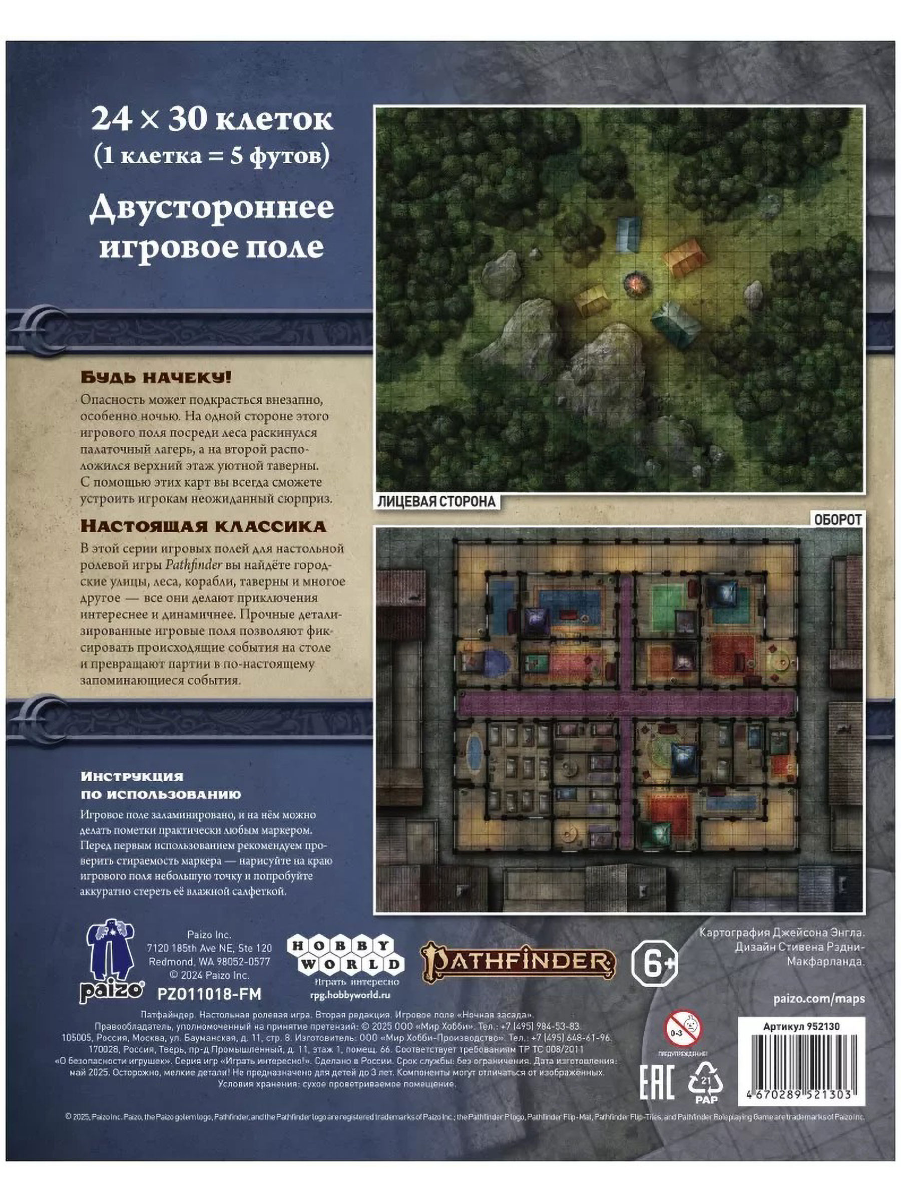 На первый взгляд всё спокойно: герои отдыхают у костра, сторожевой пёс сладко дремлет, звёзды сияют над головой... но мастер уже что-то чертит за ширмой. "Ночная засада" – двухсторонний флипмат для Pathfinder, который идеально подойдёт как раз для таких моментов – когда всё идёт не по плану. И неважно, устроите ли вы нападение разбойников, визит призраков или просто переполох в таверне – с этим полем вы легко перенесёте любую сцену прямо на стол.