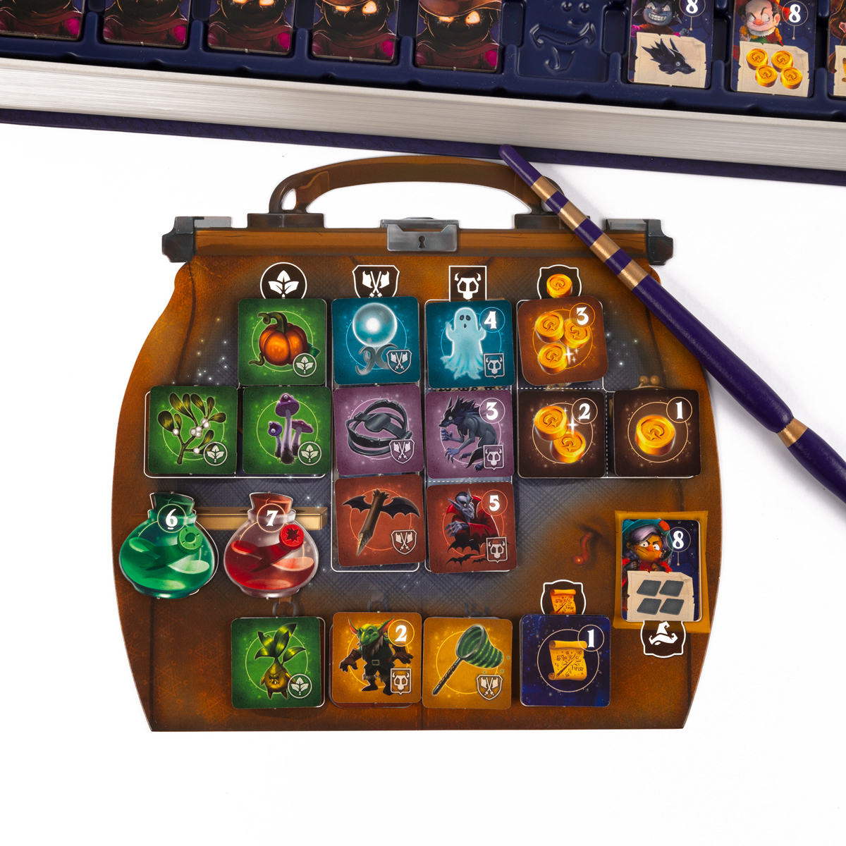 Вы также сможете выбирать жетоны зелий, если у вас есть необходимые ингредиенты для их приготовления, а ещё жетоны книг магии в экспертном режиме.