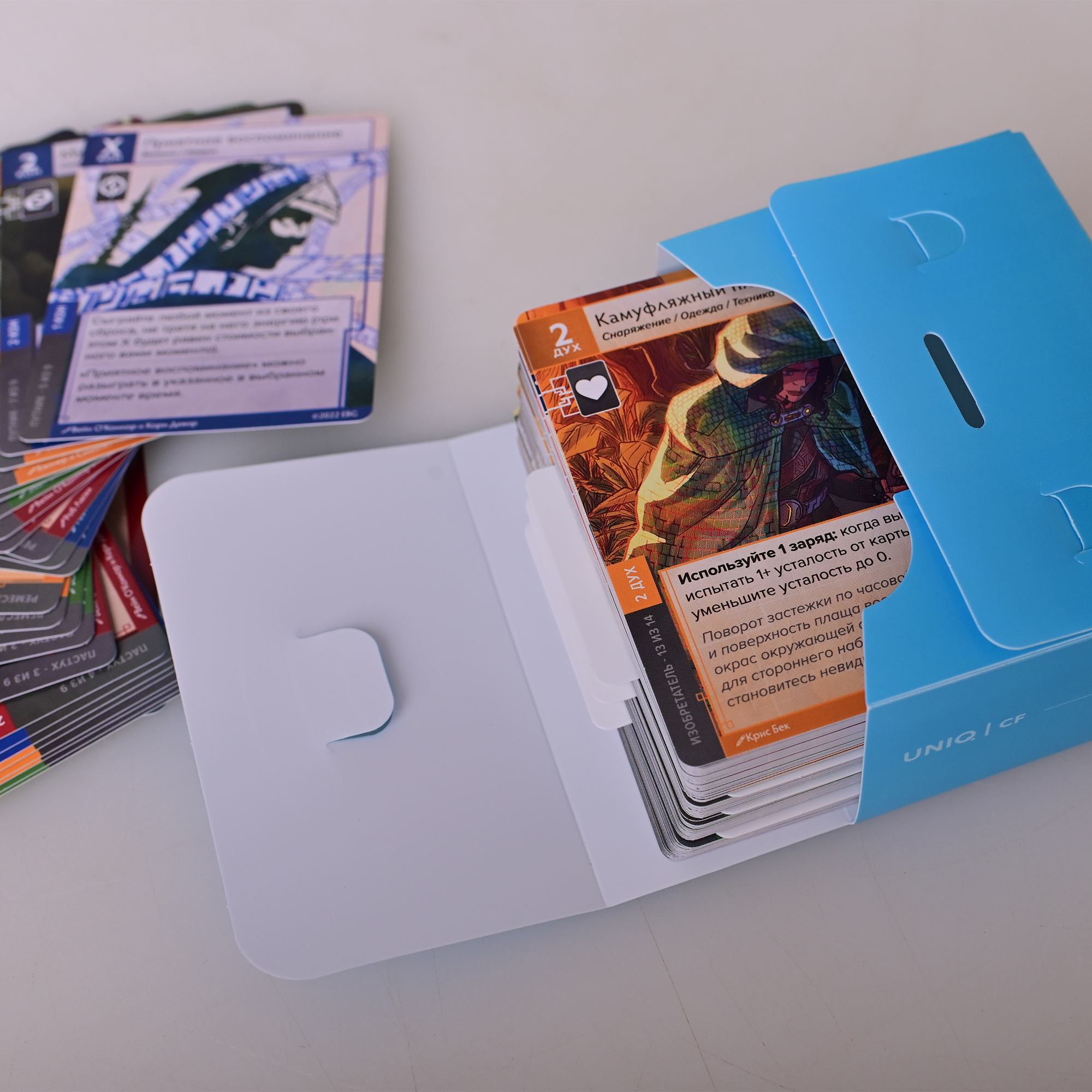 Хотя, теперь можно и насыпать и мелких компонентов, не вывалятся. Укомплектован 3 белыми разделителями. Вмещает без протекторов до 100 карт / в протекторах 60 карт.
