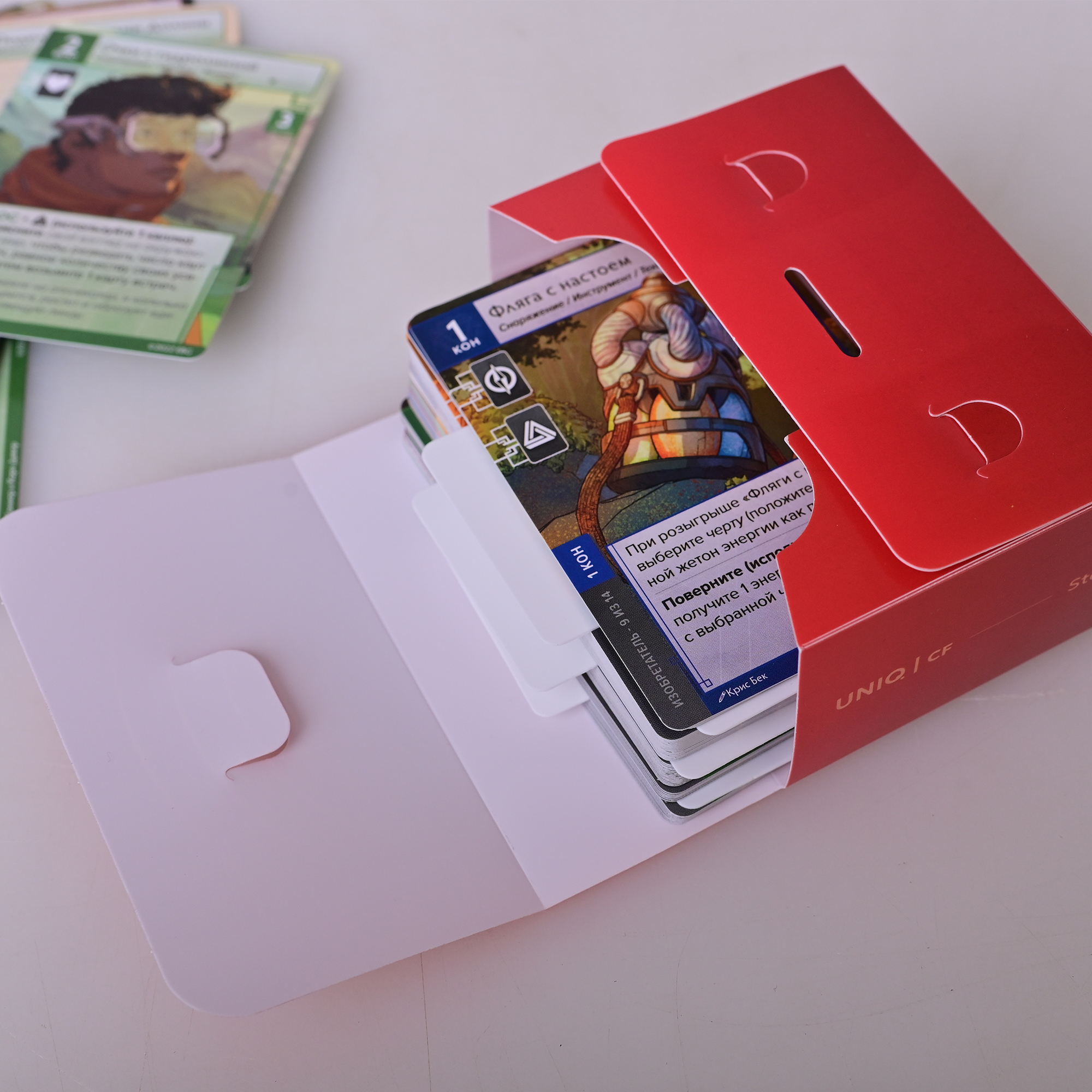 Хотя, теперь можно и насыпать и мелких компонентов, не вывалятся. Укомплектован 3 белыми разделителями. Вмещает без протекторов до 100 карт / в протекторах 60 карт.