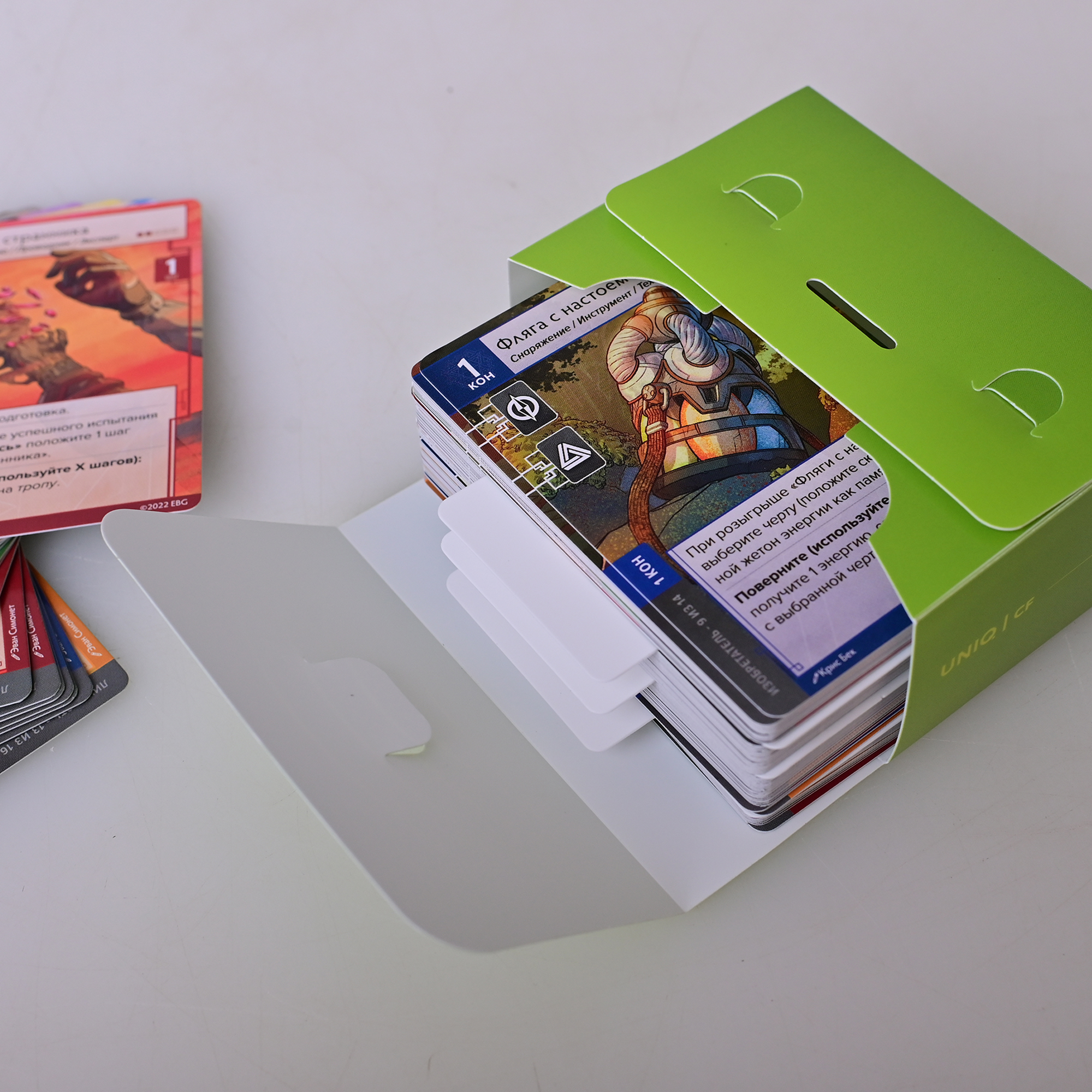 Хотя, теперь можно и насыпать и мелких компонентов, не вывалятся. Укомплектован 3 белыми разделителями. Вмещает без протекторов до 100 карт / в протекторах 60 карт.