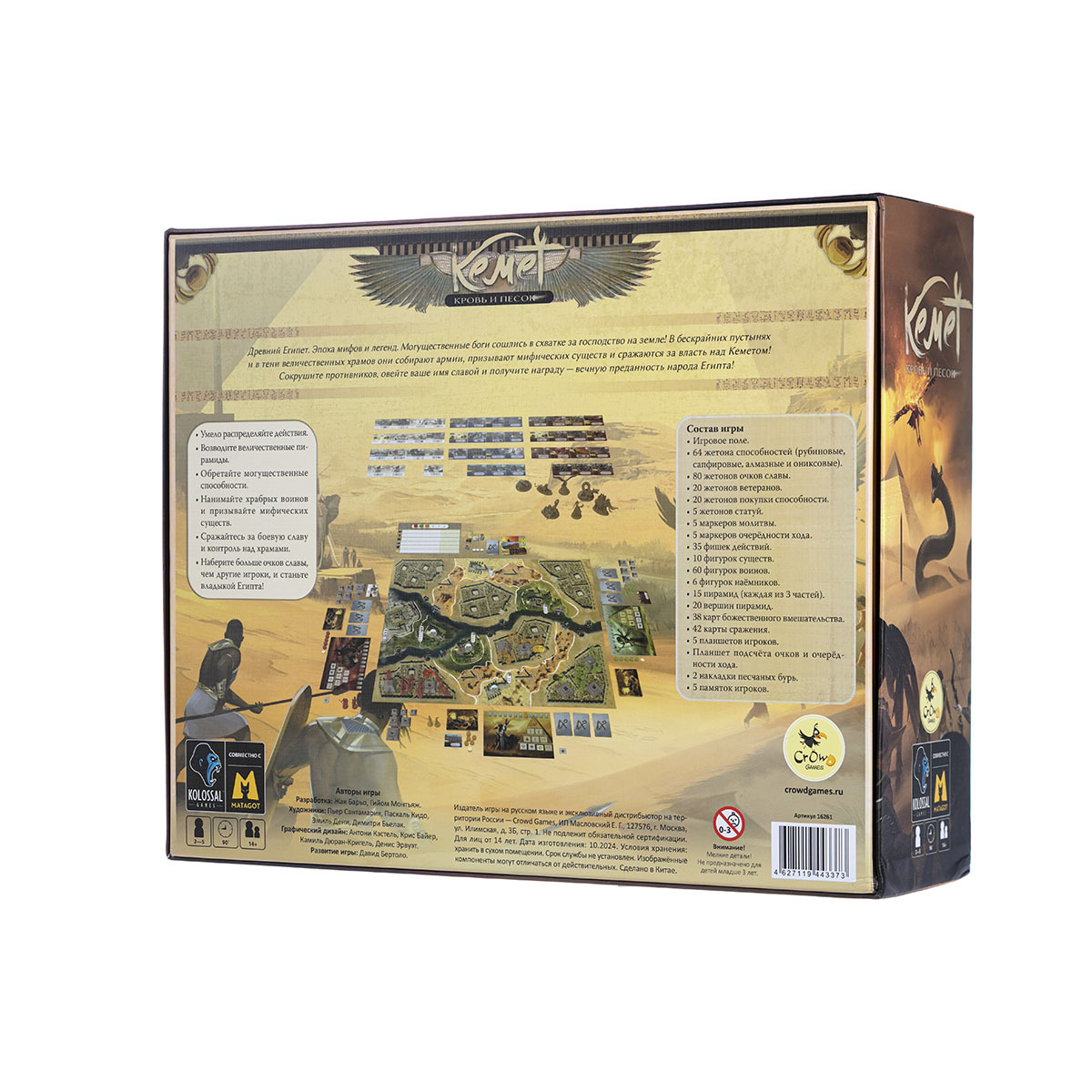 «Кемет. Кровь и песок» — это обновленная версия известной настольной игры на контроль территорий, в которой участники стремятся захватить власть над Египтом, выбирая в покровители различных богов. Вам предстоит управлять войсками, используя новые стратегические подходы, сделавшие игру ещё более доступной и интересной. В новой версии немного изменена карта, улучшены фигурки, и добавлены другие интересные элементы, делающие игровой процесс более удобным.