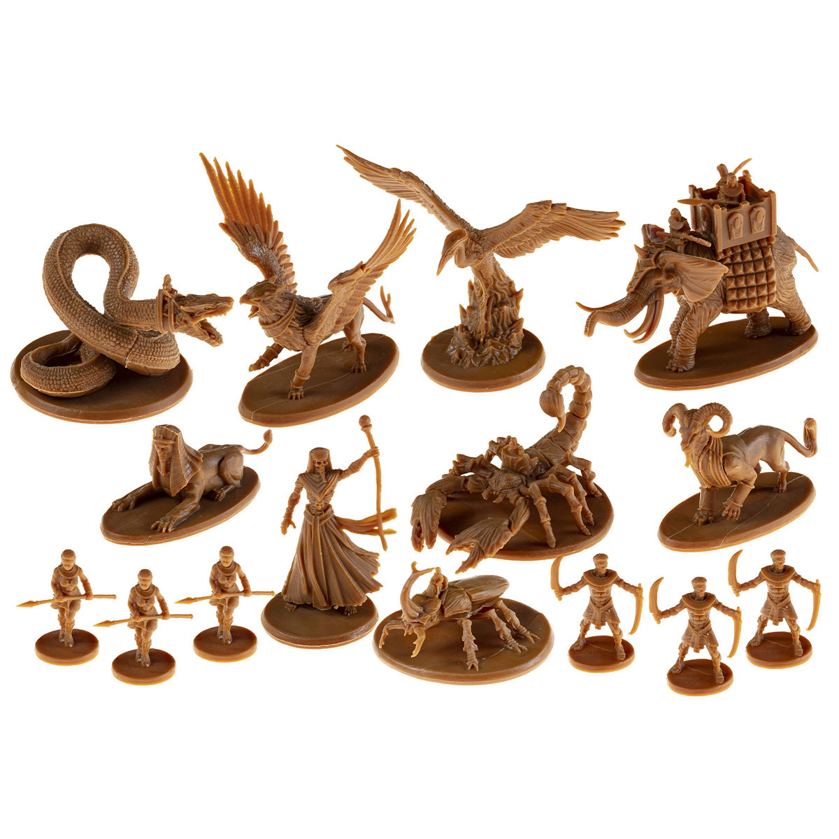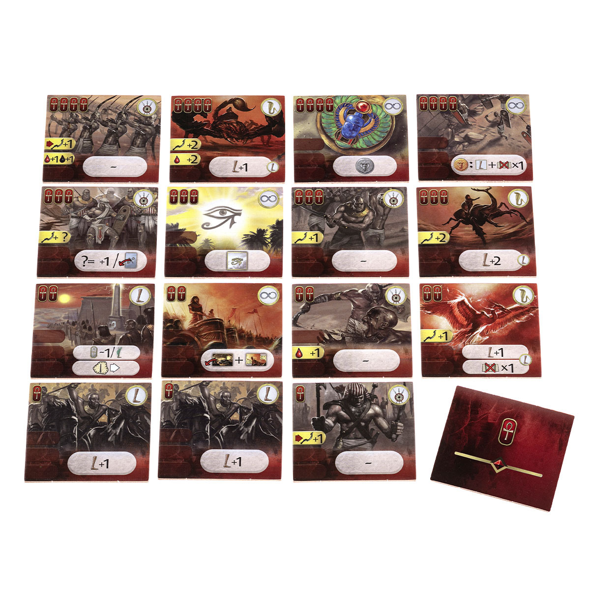 В течение игры вы будете строить пирамиды и покупать жетоны способностей — и то и другое приносит постоянные бонусы. Помолившись, будете получать благословение богов. За очки молитвы можно нанимать воинов, а воинов, в свою очередь, перемещать по карте. Во время сражения (которое начинается, как только ваши войска оказываются на одной клетке с войсками противника) вы будете складывать боевую силы воинов с бонусами жетонов способностей, а также с бонусами разыгранной из руки карты. Основная цель — накопить максимальное количество очков славы. Получить их можно в сражениях, при покупке определённых жетонов и, конечно, за контроль территорий.