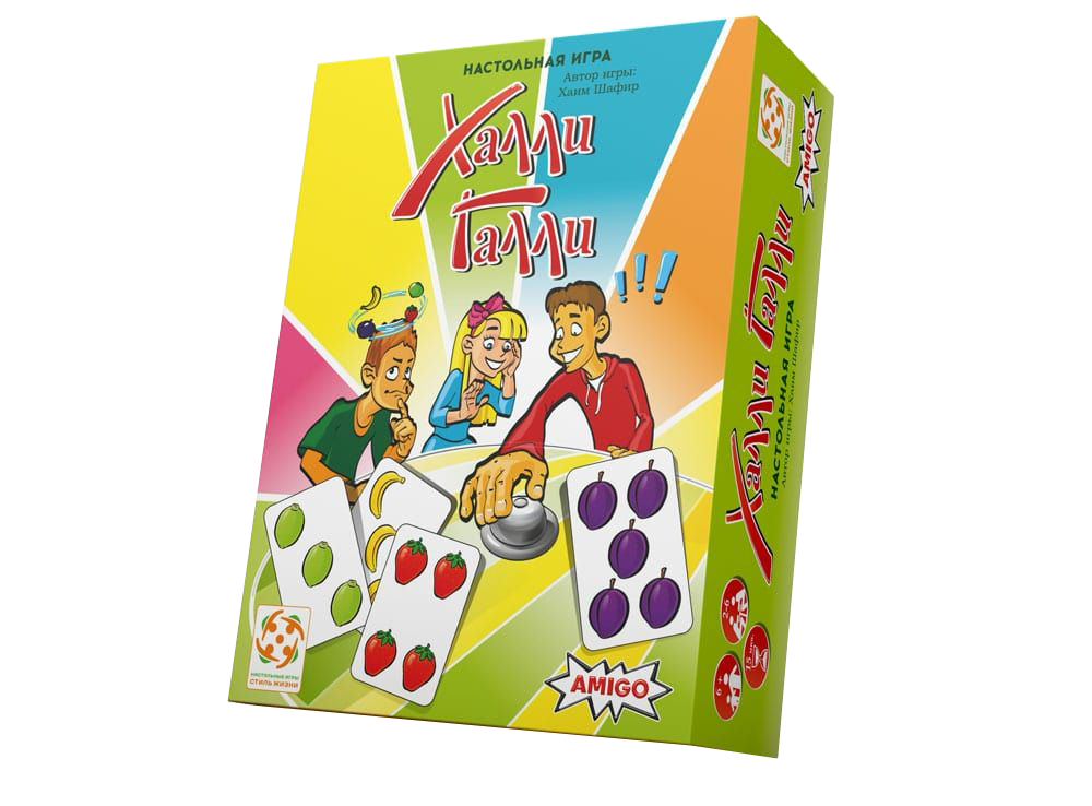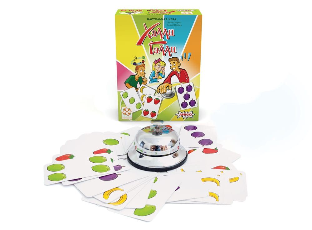 Итак, у вас есть колода из 56 карт: на каждой карте изображен один вид фруктов (бананы, клубника, лаймы или сливы) в количестве от 1 до 5. Карты раздаются поровну между участниками, в центре стола ставится звонок. Игроки по очереди открывают карты, и как только на открытых картах всех игроков в сумме оказывается ровно 5 фруктов одного вида – надо звонить в звонок. Самый быстрый и внимательный забирает все открытые карты себе. Игрок, ошибочно хлопнувший по звонку, в качестве штрафа, отдает по одной из своих карт каждому участнику состязания. Побеждает в итоге тот, у кого в конце игры окажутся все карты.Настольная игра Халли Галли отлично тренирует устный счет, внимательность, скорость реакции. Это очень веселое и азартное соревнование для детей и их родителей. Развлечься с пользой может от 2 до 6 участников, компактные размеры игры позволяют взять ее с собой в путешествие или в гости. Качественные карты и звонок (довольно прочный), а также яркое оформление коробки делают игру ещё и отличным подарком.