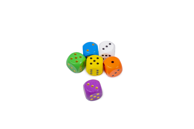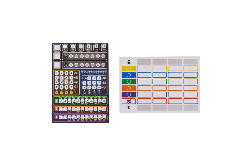 - 6 кубиков D6 (1 белый, 1 жёлтый, 1 синий, 1 зелёный, 1 оранжевый, 1 фиолетовый);