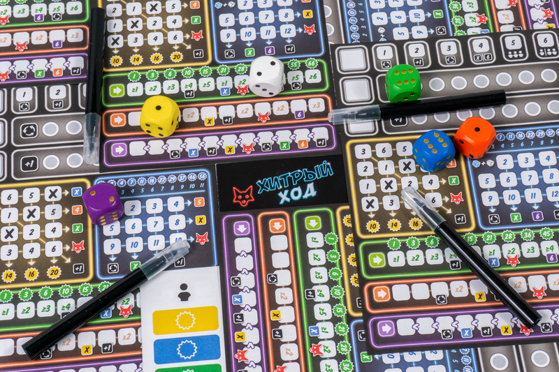 Вот здесь и начинается настоящая головоломка: разные кубики дают разное количество очков, синий кубик не работает без белого, результат зелёного должен увеличиваться каждый раз на один по шкале, а в оранжевом ряду нужно подобрать лучшее значение под лучший множитель. Игра недаром называется «Хитрый ход» — в конце партии вы сами удивитесь, как вам удалось провернуть такую комбинацию.