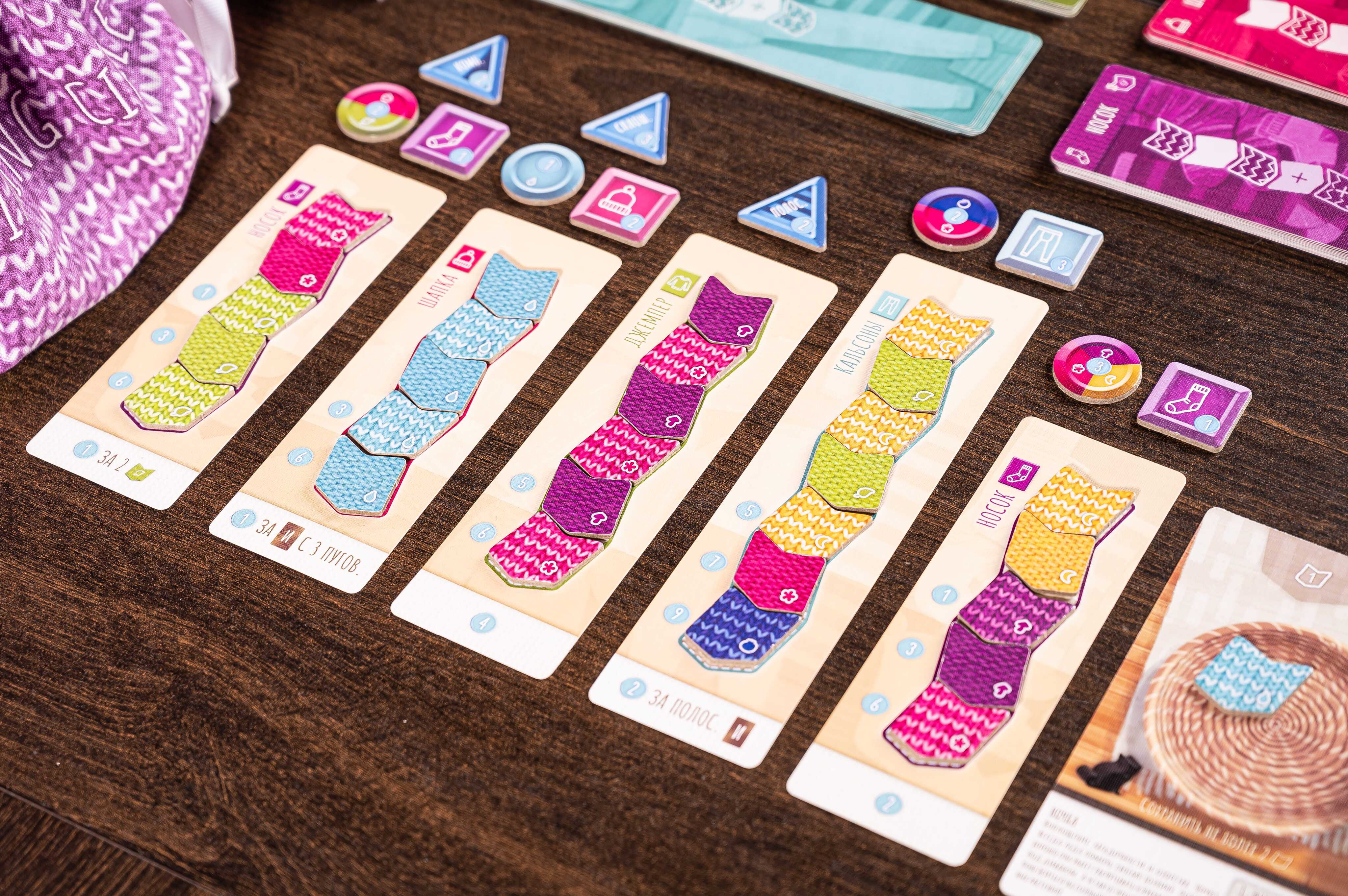 «Клубочки» — семейная игра о создании самых красивых вязанных изделий, в которой нужно собирать наборы и одновременно выполнять разнообразные задачи: личные, общие и бонусные. Постарайтесь найти синергии между задачами, тогда один ход может принести вам сразу кучу очков!