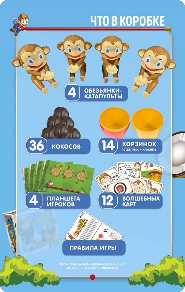 - У каждого игрока есть своя игровая зона, в которой он будет использовать специальную мартышку – катапульту. В свой ход игрок кладёт один кокос в лапы обезьянке и... запускает его в неизвестность... Задача проста – попасть в один из стаканчиков, расположенных на игровом столе. Попал? Забирай стаканчик себе и ставь на одну из круглых отметок у себя на игровом планшете. Ход переходит другому игроку. Если попадание в красный стаканчик, тогда даётся право на дополнительный бросок;