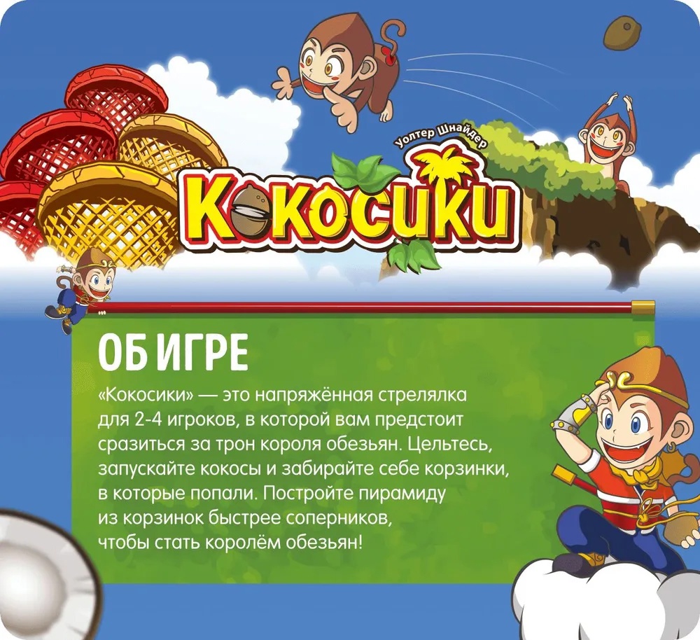 «Кокосики» — это напряжённая стрелялка для 2-4 игроков, в которой вам предстоит сразиться за трон короля обезьян. Цельтесь, запускайте кокосы и забирайте себе корзинки, в которые попали. Постройте пирамиду из корзинок быстрее соперников, чтобы стать королём обезьян!