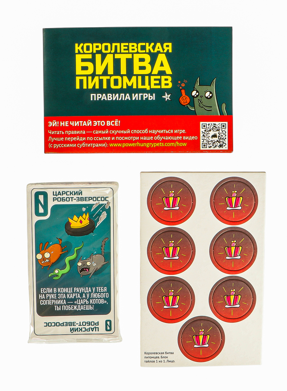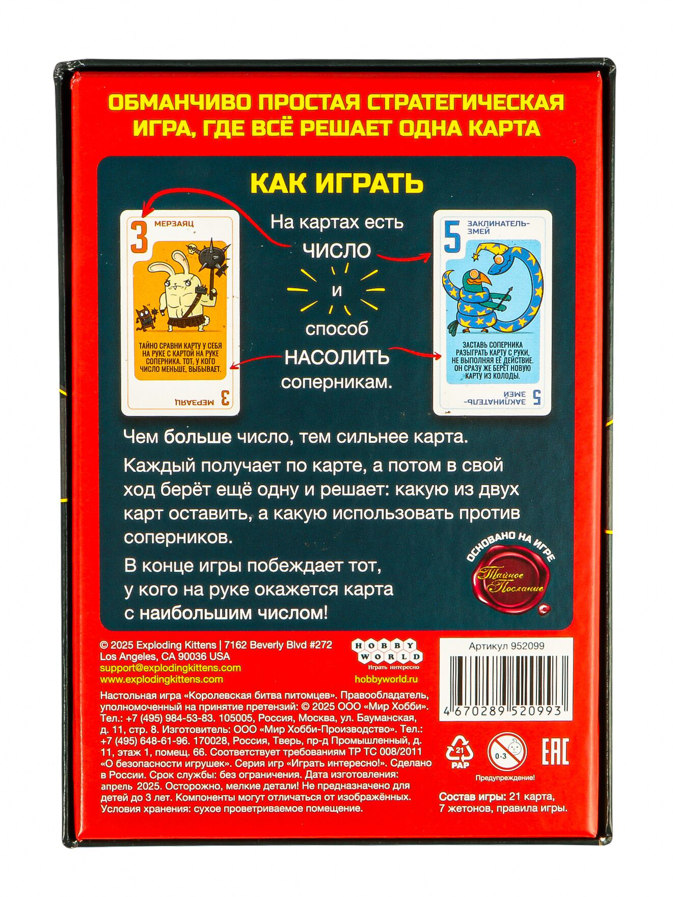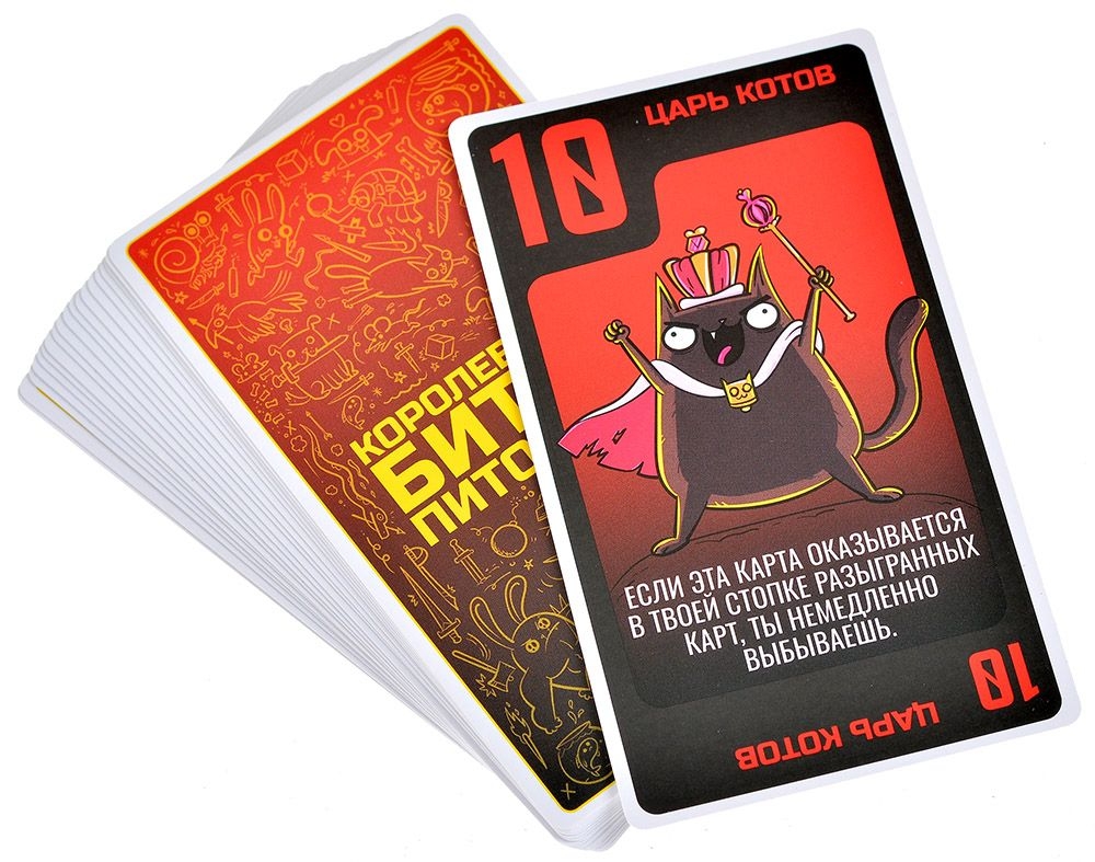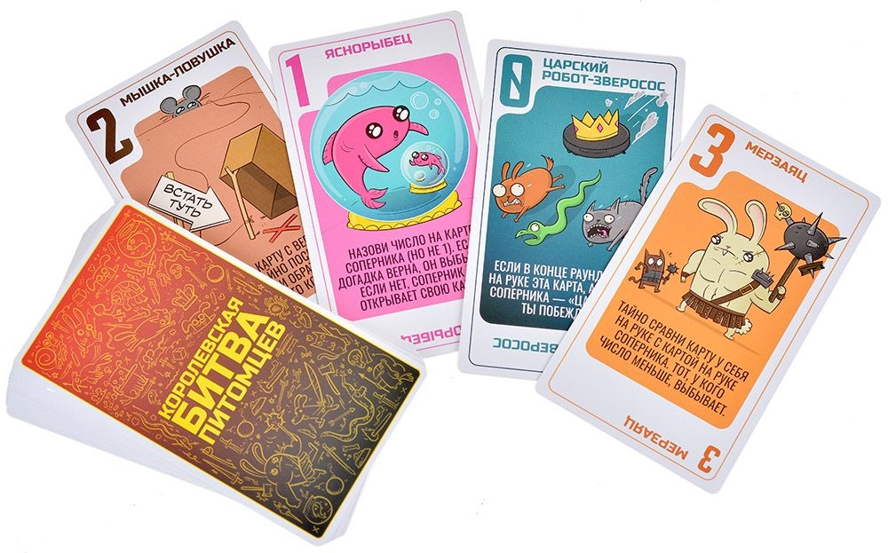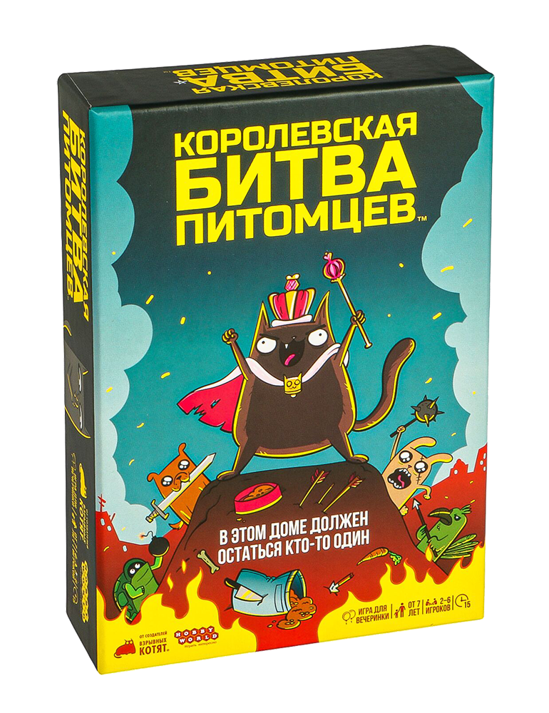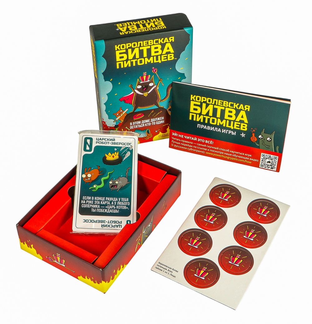 "Королевская битва питомцев" – это весёлая вечериночная игра от создателей знаменитых и любимых множеством "Взрывных котят". Здесь каждый раунд превращается в стремительное столкновение чисел и коварных способностей. Всё начинается с одной карты и одной же картой заканчивается – и лучше бы у неё было самое большое число среди всех собравшихся за столом! Ведь если бы хотите победить, не нужно быть гением: ваша карта просто должна побить все остальные. В чём сложность (и самое веселье)? В том, что лишние карты вы будете разыгрывать! Выбивать соперников из игры, красть карты, устраивать хаос на поле – или, наоборот, защищаться от нападок. Звучит легко, да? На словах-то всё понятно, вот только соперники тоже не дремлют и только и ждут, как бы устроить вам какую-нибудь карточную гадость...