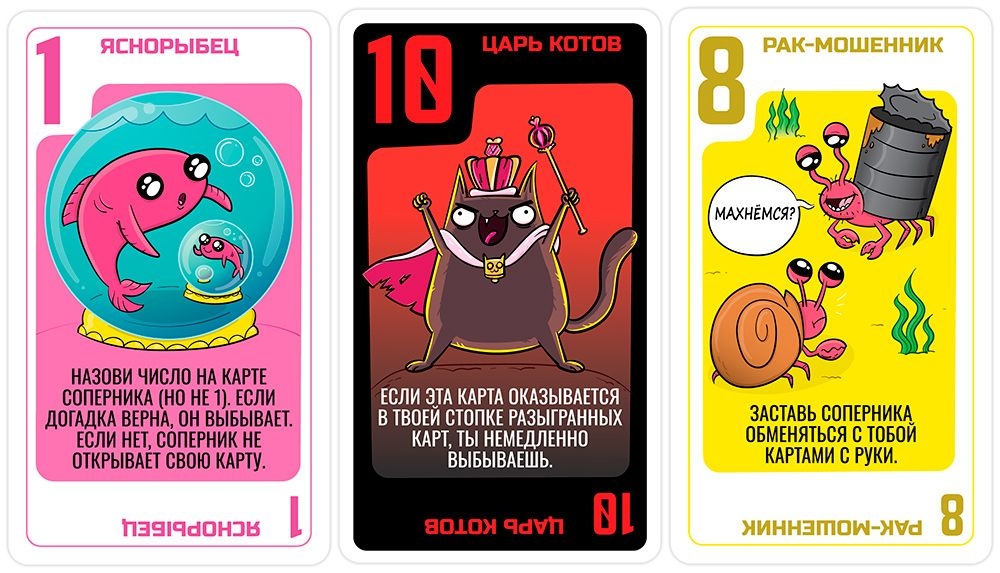 Дальше всё просто: в свой ход возьмите новую карту из колоды. Теперь у вас их будет две и вам понадобится решить, какую оставить себе, а какую разыграть. Действия карты бывают самые разные. Некоторые помогут вам приблизиться к победе (а то и вовсе моментально стать победителем – например, если у вас на руках окажется "Царский робот-зверосос", а у другого игрока – "Царь котов"), другие – выбить из игры соперника, а третьи вполне способны усложнить жизнь вам самим. Что бы вам ни досталось, помните: прежде всего важно постараться сохранить карту с наибольшим номиналом, ведь именно так вы сможете побить карты соперников, когда раунд закончится!