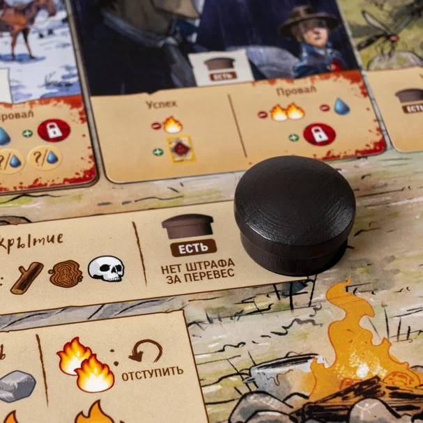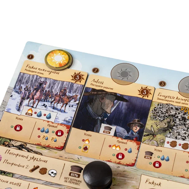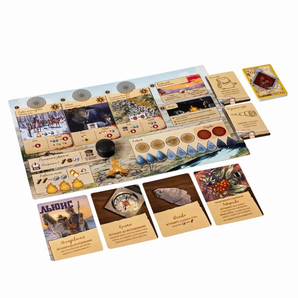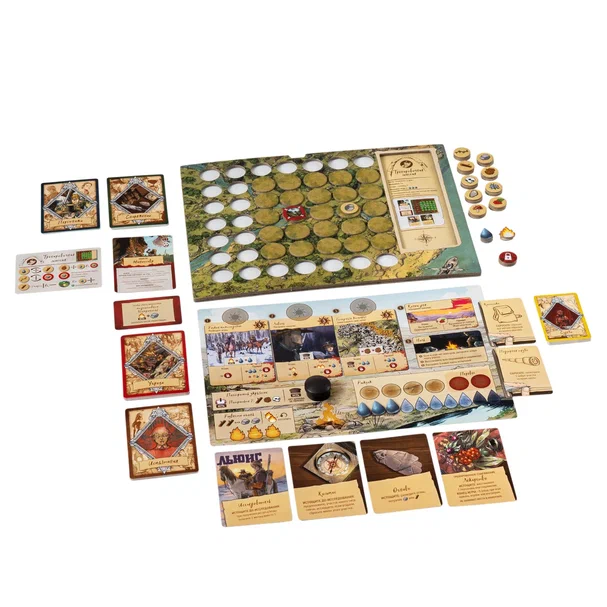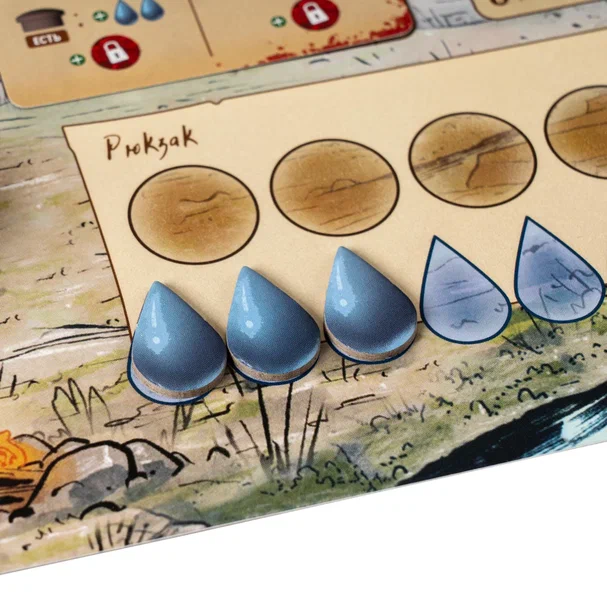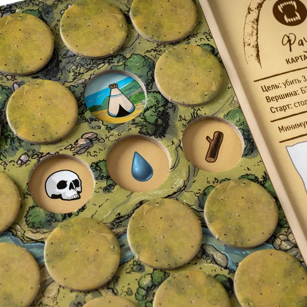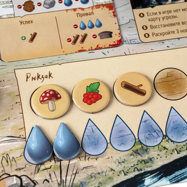 Все необходимые ресурсы скрыты на карте местности. В свой ход вы открываете выбранный участок (соседний с уже изученным) и получаете найденный ресурс. Эффекты снаряжения помогут приумножить ваши достижения или сгладить результат неудачи.