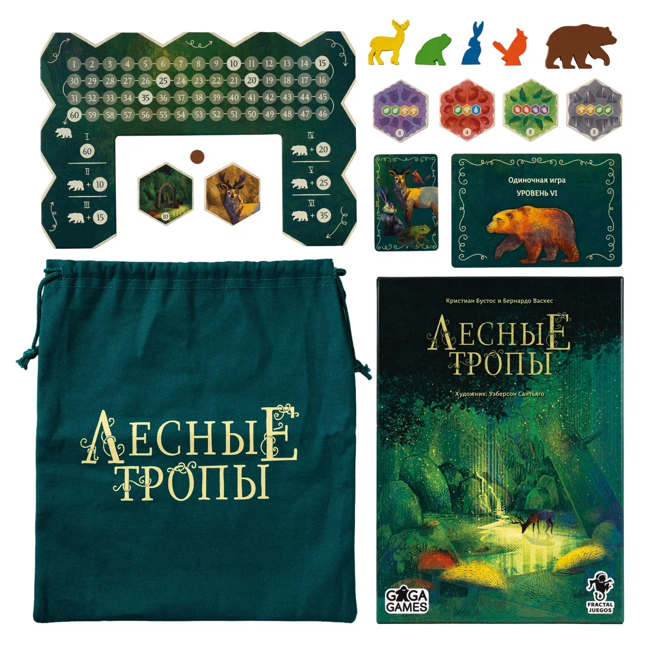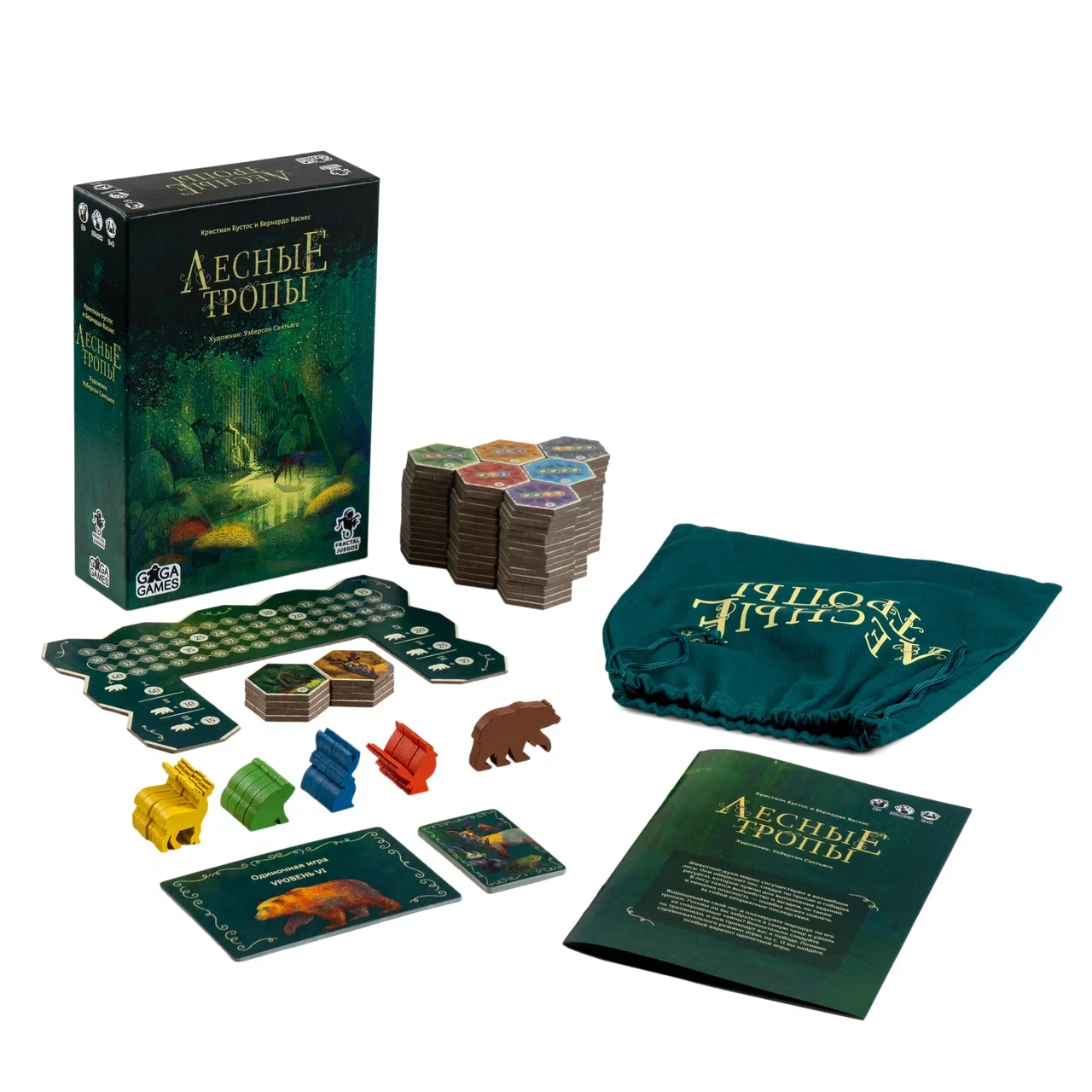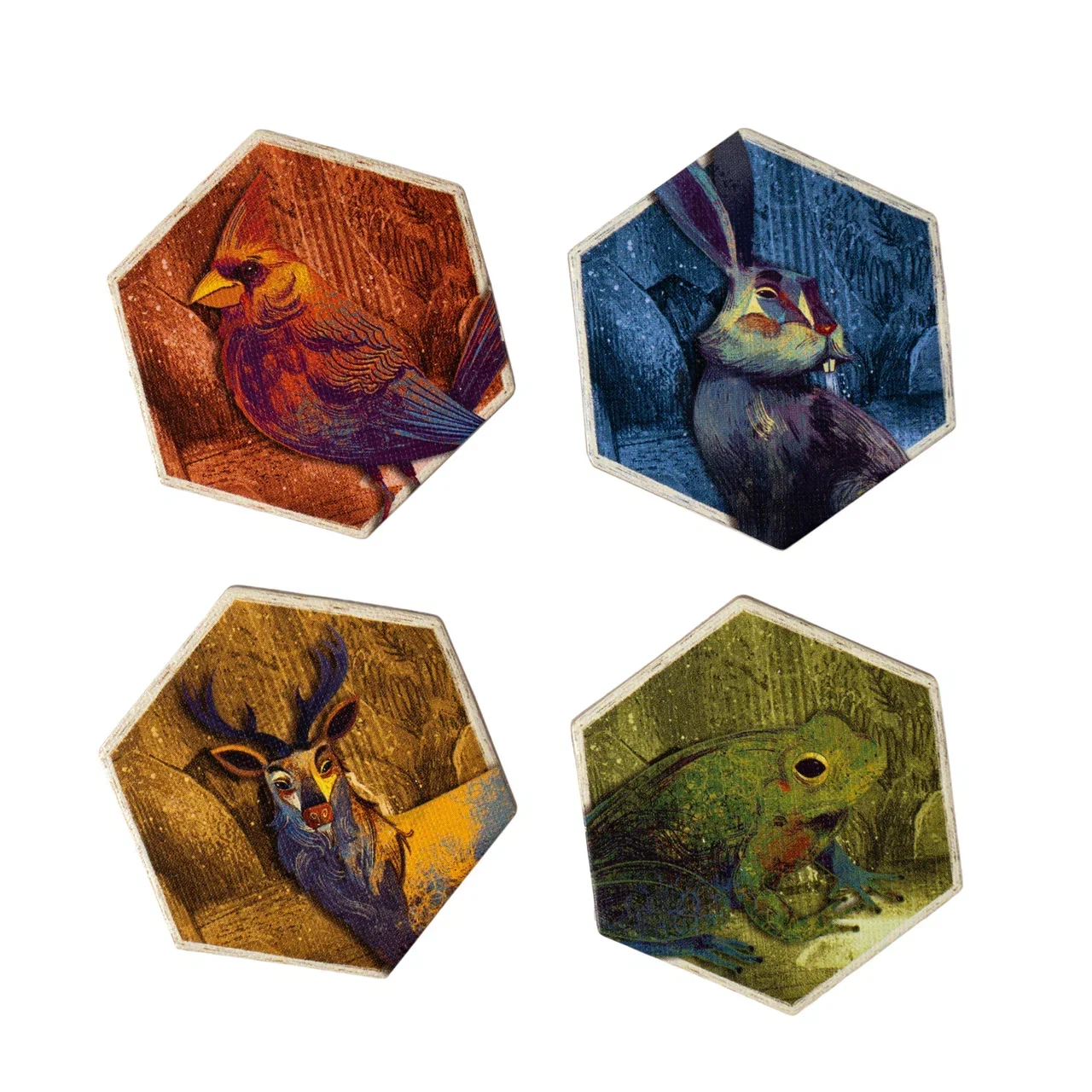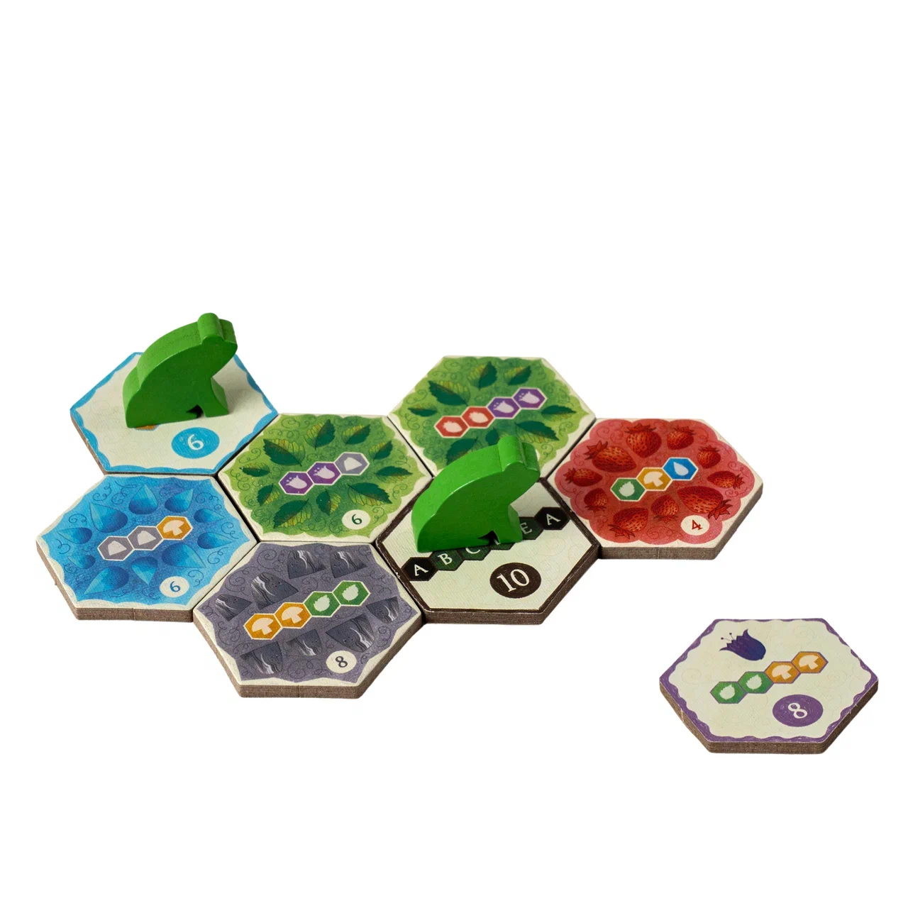 Игра впечатляет ещё и качеством компонентов. Объёмные деревянные жетоны животных так и хочется выставлять на разноцветном тайловом поле. Сами шестигранные тайлы очень плотные и точно выдержат много партий. Акварельные иллюстрации и фантастически-сказочное оформление вдохновляют на незабываемую прогулку по лесу. Или на непримиримую борьбу кланов лягушек и оленей!