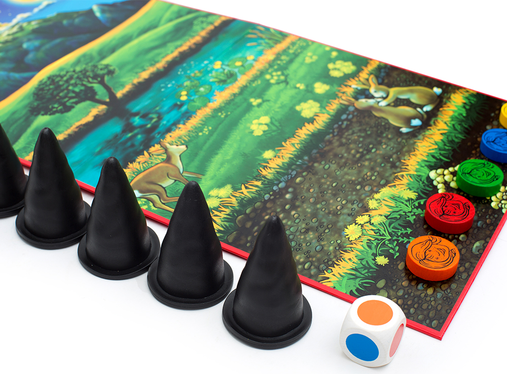 В состав настольной игры Маленькие Ведьмочки (Husch Husch kleine Hexe) входят: 1 игровое поле, 5 фишек разных цветов, 5 ведьминских шляп, 1 кубик для выбора цвета. Правила игры на руском языке вы можете скачать на нашем сайте.