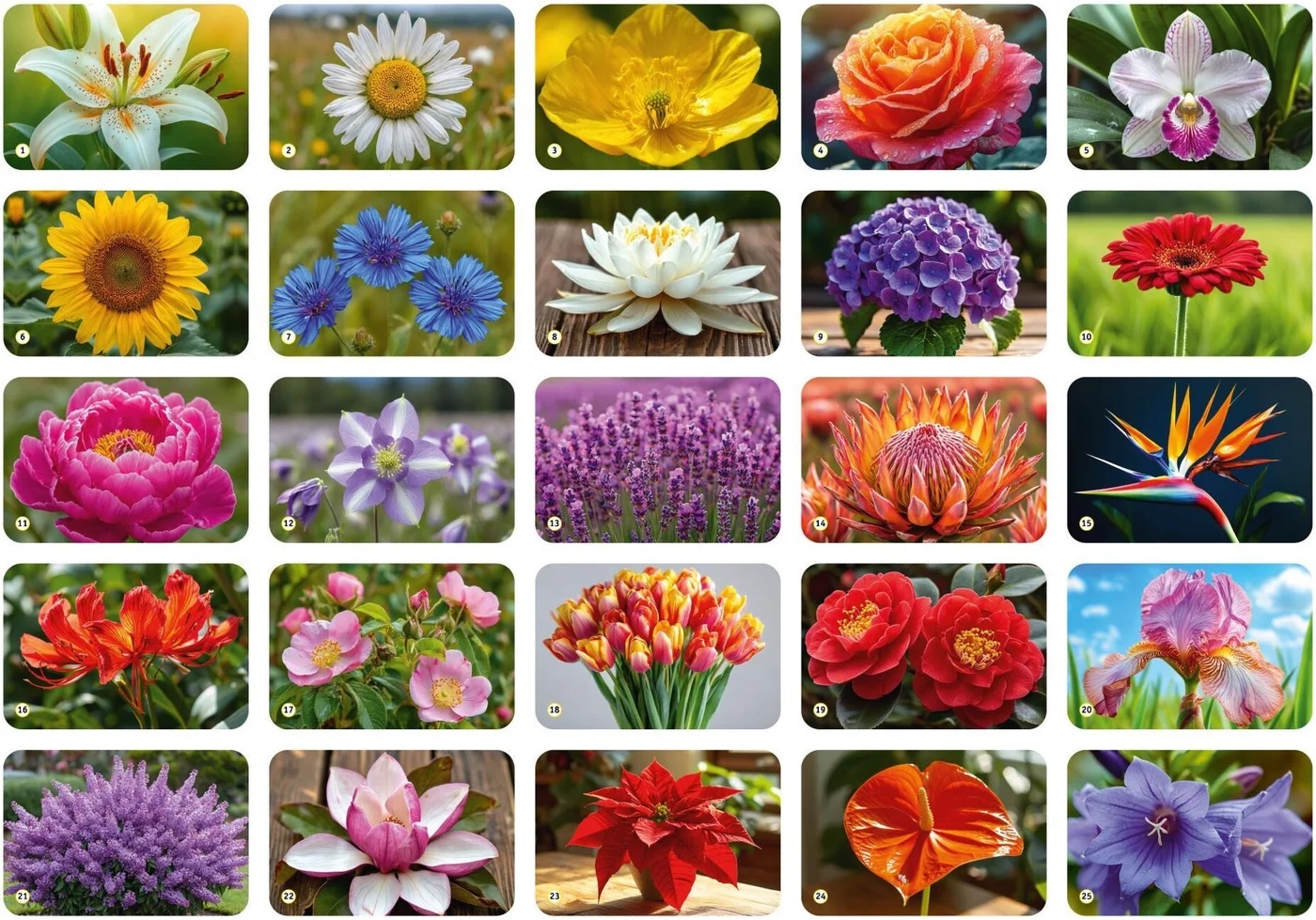 В игре представлено 25 видов цветов. В комплекте к игре вы найдёте красочный буклет с описанием всех цветов + наклейки в подарок внутри коробки. Наверняка вы узнаете много нового, ведь существует даже целая историческая дисциплина, занимающаяся изучением растений и цветов - ботаника.