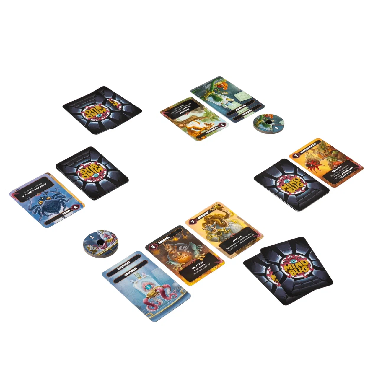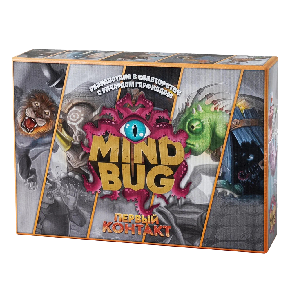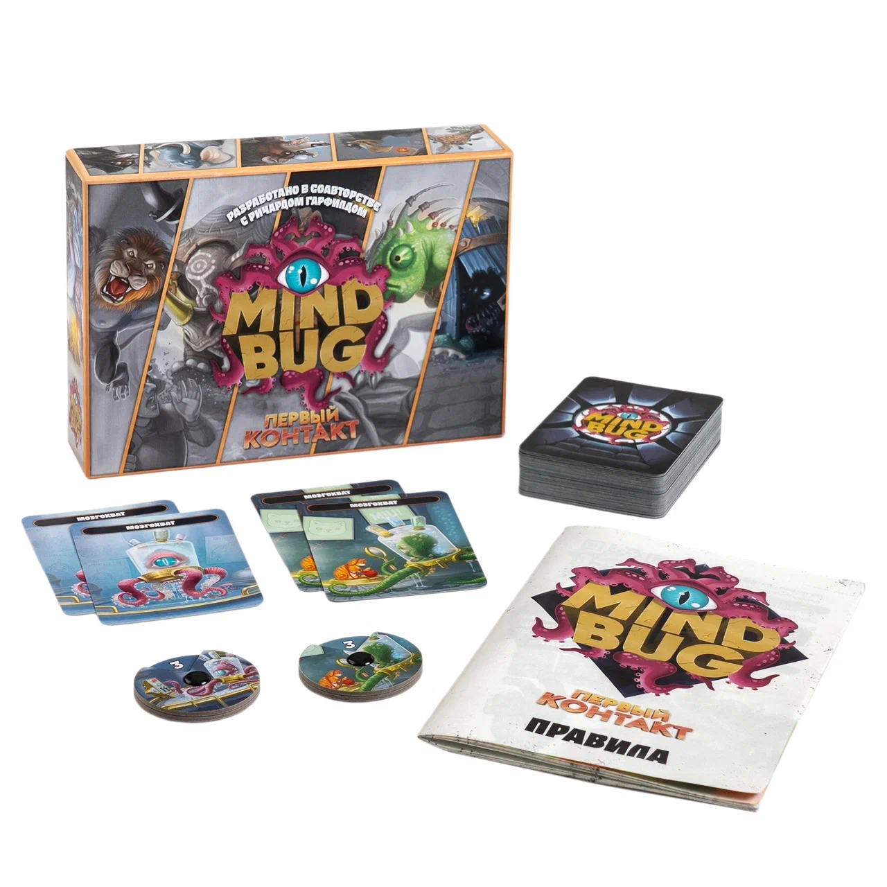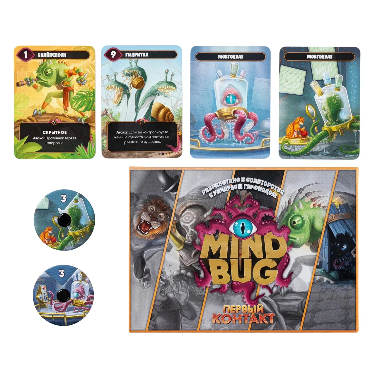 Mindbug — это целая серия карточных дуэлей, которую открывает коробочка Mindbug: Первый контакт. В ней вас ждёт набор фантастических инопланетных созданий с сумасшедшим оформлением — ещё одной яркой особенностью этой игры. Могущественные Мозгохваты подчиняют себе странных существ с каламбурными названиями. Тут и ловкий Снайпелеон, и зубастая Собакула, и надёжные Жукощиты, и очаровательно-взрывная Жабомба. С их помощью пришельцы выясняют между собой какие-то давнишние конфликты. Пора узнать, чья сторона возьмёт верх в этой стычке галактического масштаба!