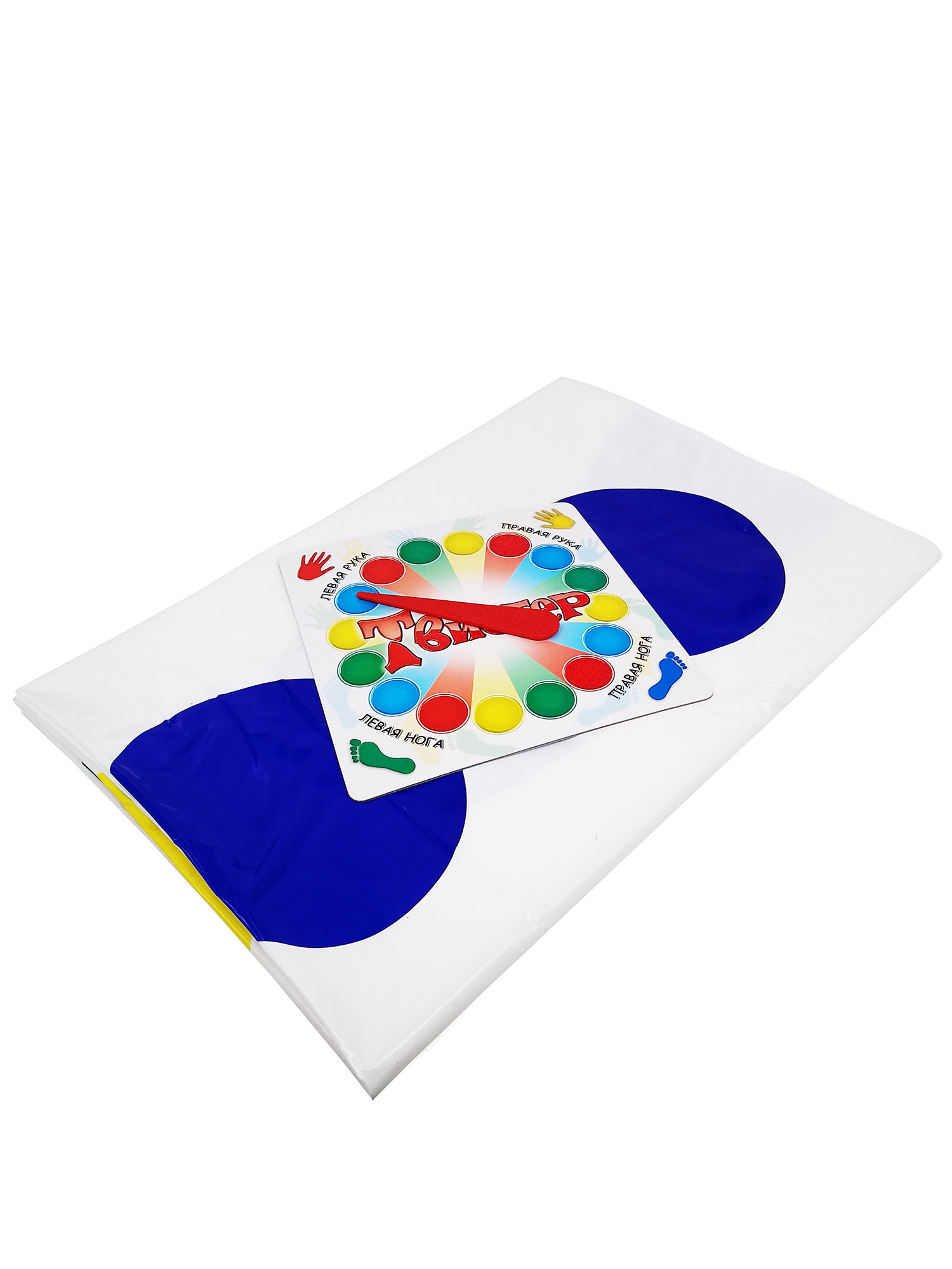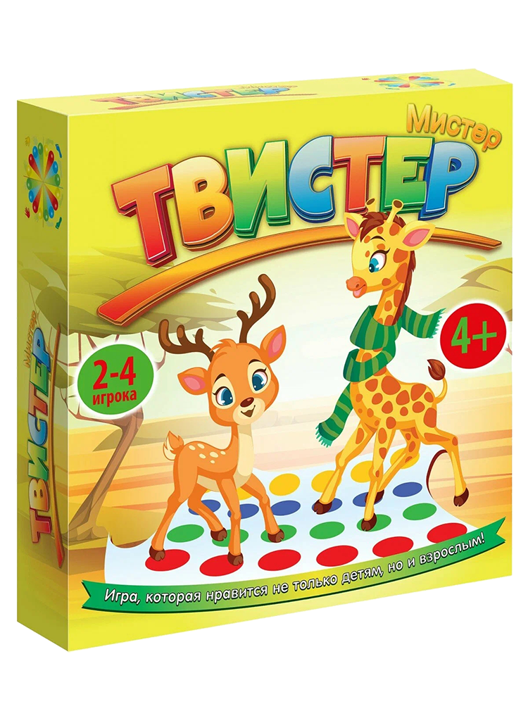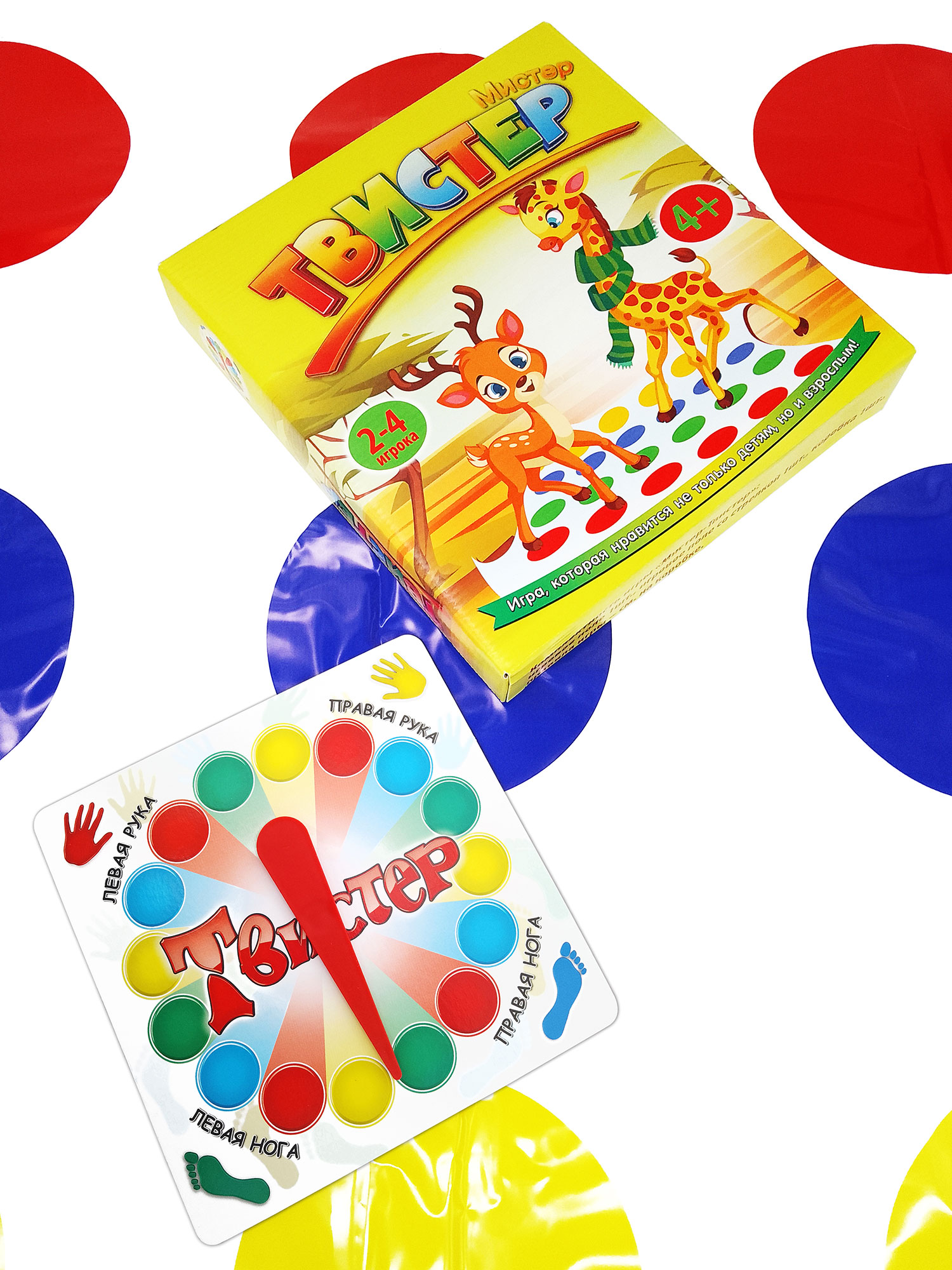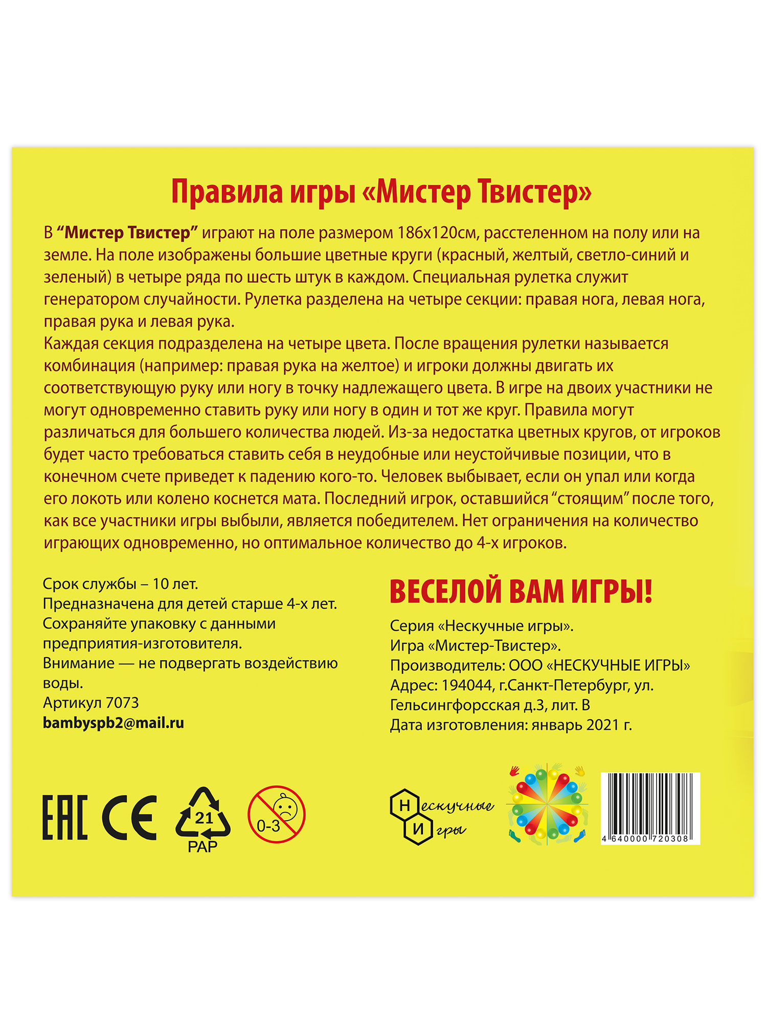 В напольную игру Нескучные игры "Мистер Твистер" играют на поле размером 186x120 см, расстеленном на полу или на земле.На поле изображены большие цветные круги (красный, желтый, светло-синий и зеленый) в четыре ряда по шесть штук в каждом. Специальная рулетка служит генератором случайности.