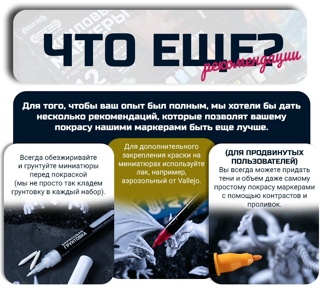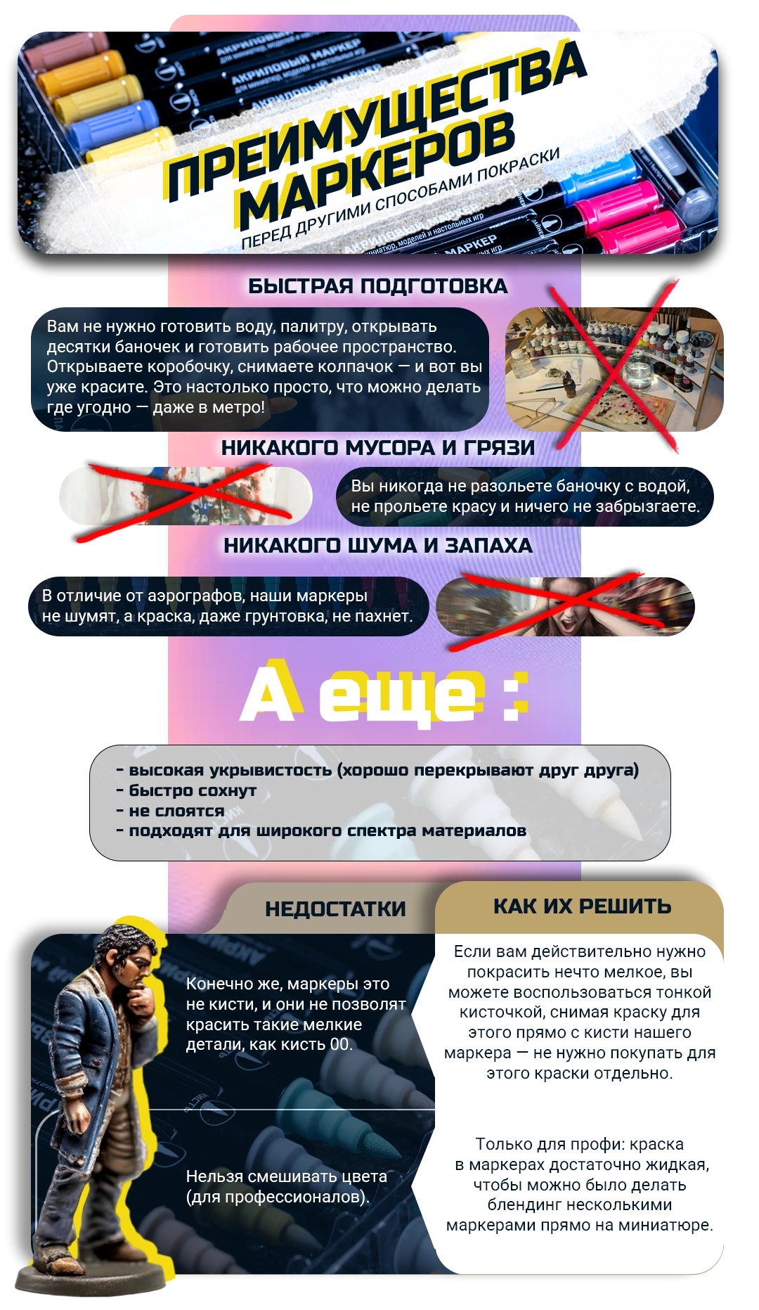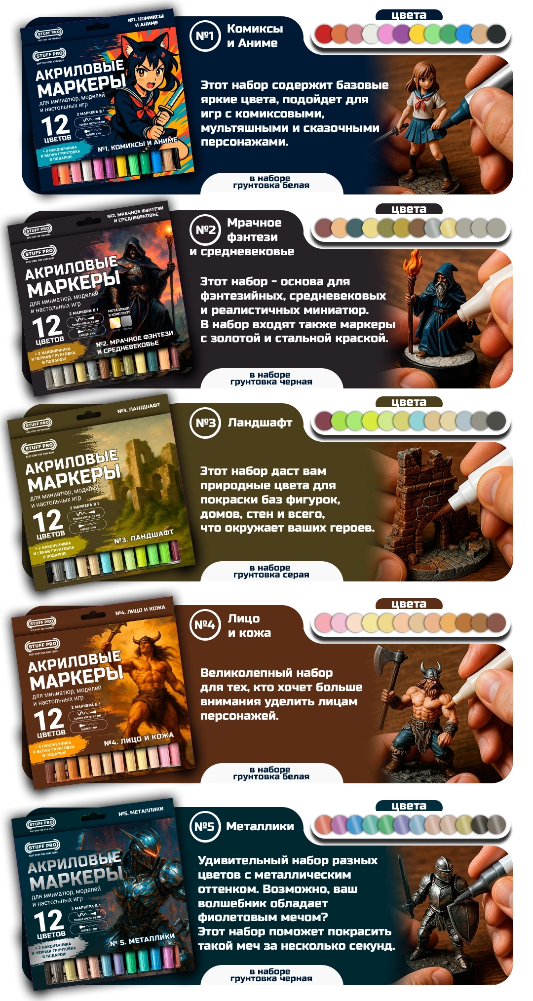 Набор из 12 акриловых маркеров. Содержит базовые яркие цвета, подойдет для игр и миниатюр с комиксовыми, мультяшными и сказочными персонажами. В набор также входит серая грунтовка. Каждый маркер имеет два наконечника: тонкая кисть (1-5 мм) и лайнер (1 мм).