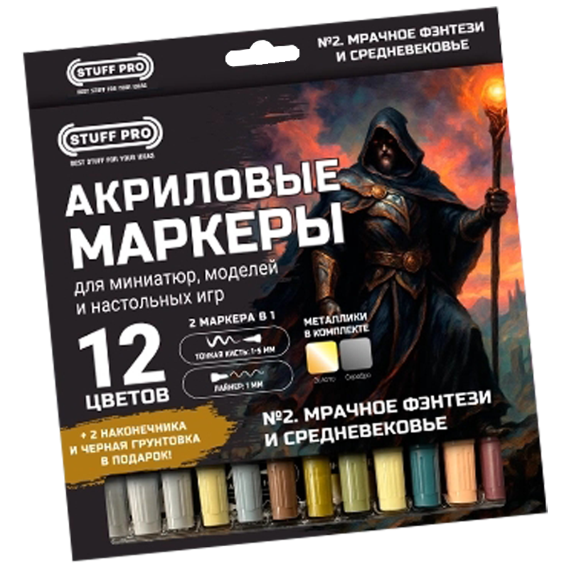 Набор из 12 акриловых маркеров. Этот набор - основа для фэнтезийных, средневековых и реалистичных миниатюр. Помимо обычных оттенков, набор включает и 2 металлика: золотой и стальной. В набор также входит черная грунтовка. Каждый маркер имеет два наконечника: тонкая кисть (1-5 мм) и лайнер (1 мм).