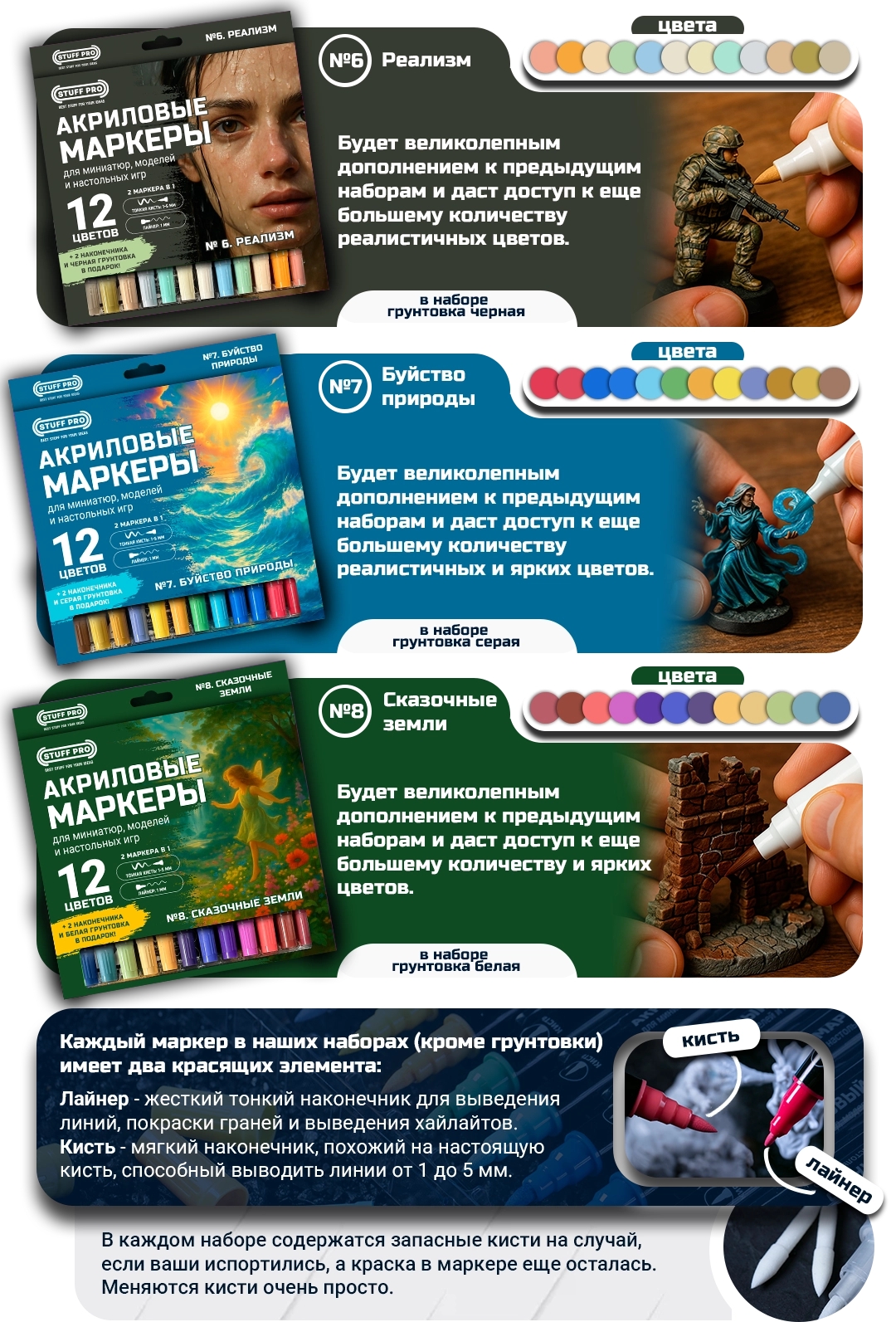 Набор из 12 акриловых маркеров. Будет великолепным дополнением к предыдущим наборам и даст доступ к еще большему количеству реалистичных цветов. В набор также входит черная грунтовка. Каждый маркер имеет два наконечника: тонкая кисть (1-5 мм) и лайнер (1 мм).