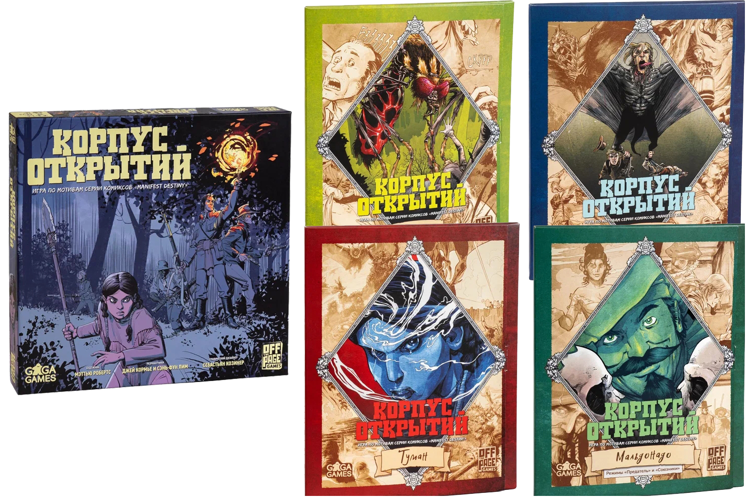 Данный набор состоит из базовой игры Корпус Открытий и 4 дополнений: Туман, Ваметри, Имаго, Мальдонадо.
