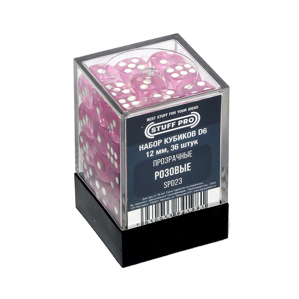 Набор кубиков Stuff Pro D6. Прозрачные Розовые (12 мм, 36 шт) (SPD23)